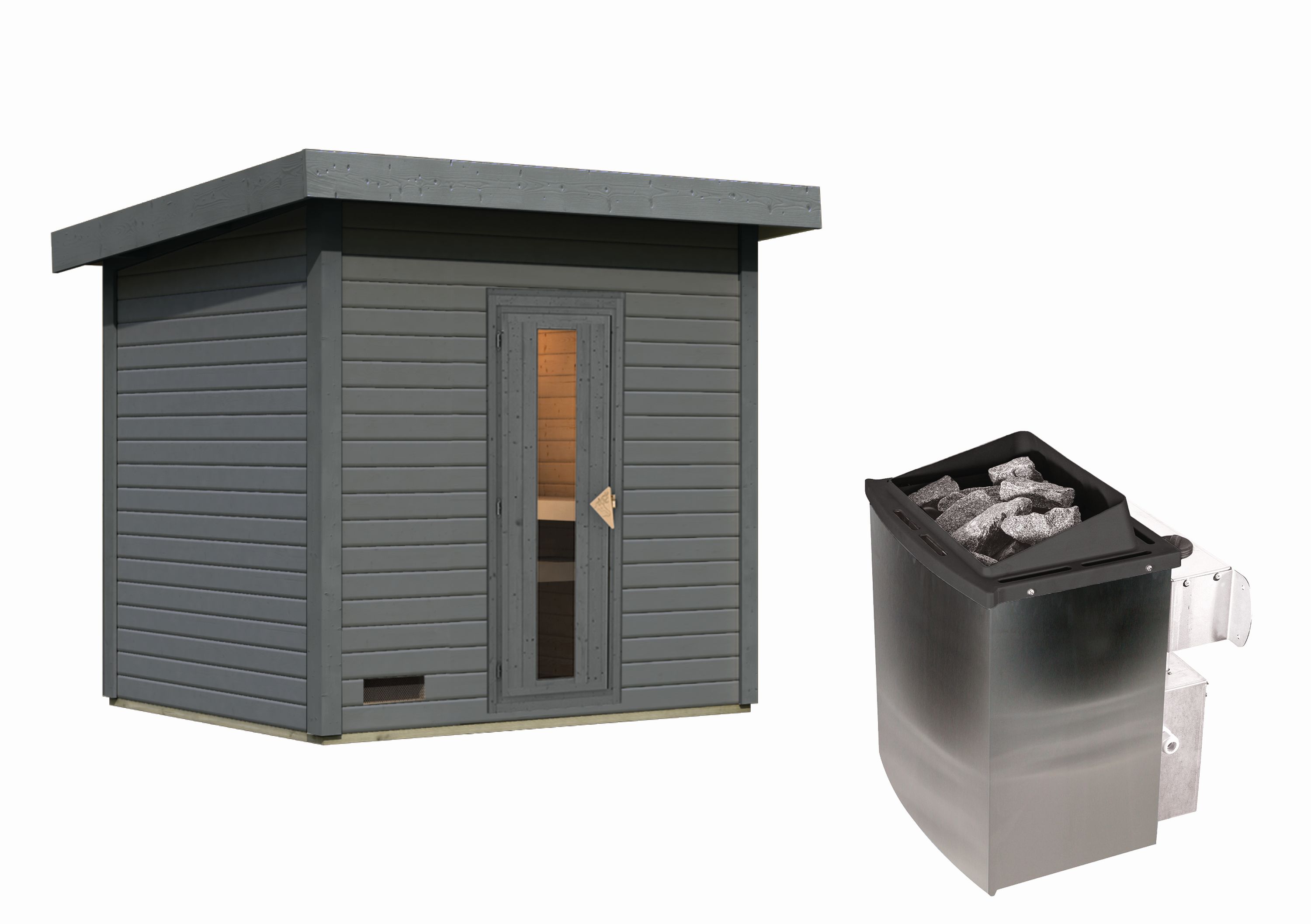 Saunieren nach dem Vorbild der Finnen. Mit dem Saunahaus Hytti 3 ist dies im eigenen Garten möglich. So ist das typische Eis- oder Schneebaden nach dem Saunagang zumindest im Winter durchaus möglich. Sollten Sie sogar einen See vor dem Haus haben, können Sie auch diesen nutzen, um sich abzukühlen. Das Saunahaus Hytti 3 bietet mit einem Außenmaß von 231 x 196 x 228 cm genügend Raum zum Entspannen. Nach einem stressigen Arbeitstag sich in den eigenen Garten zurückziehen und in der Außensauna entspannen oder den Urlaubstag im Garten mit einem ausgiebigen Saunagang abrunden