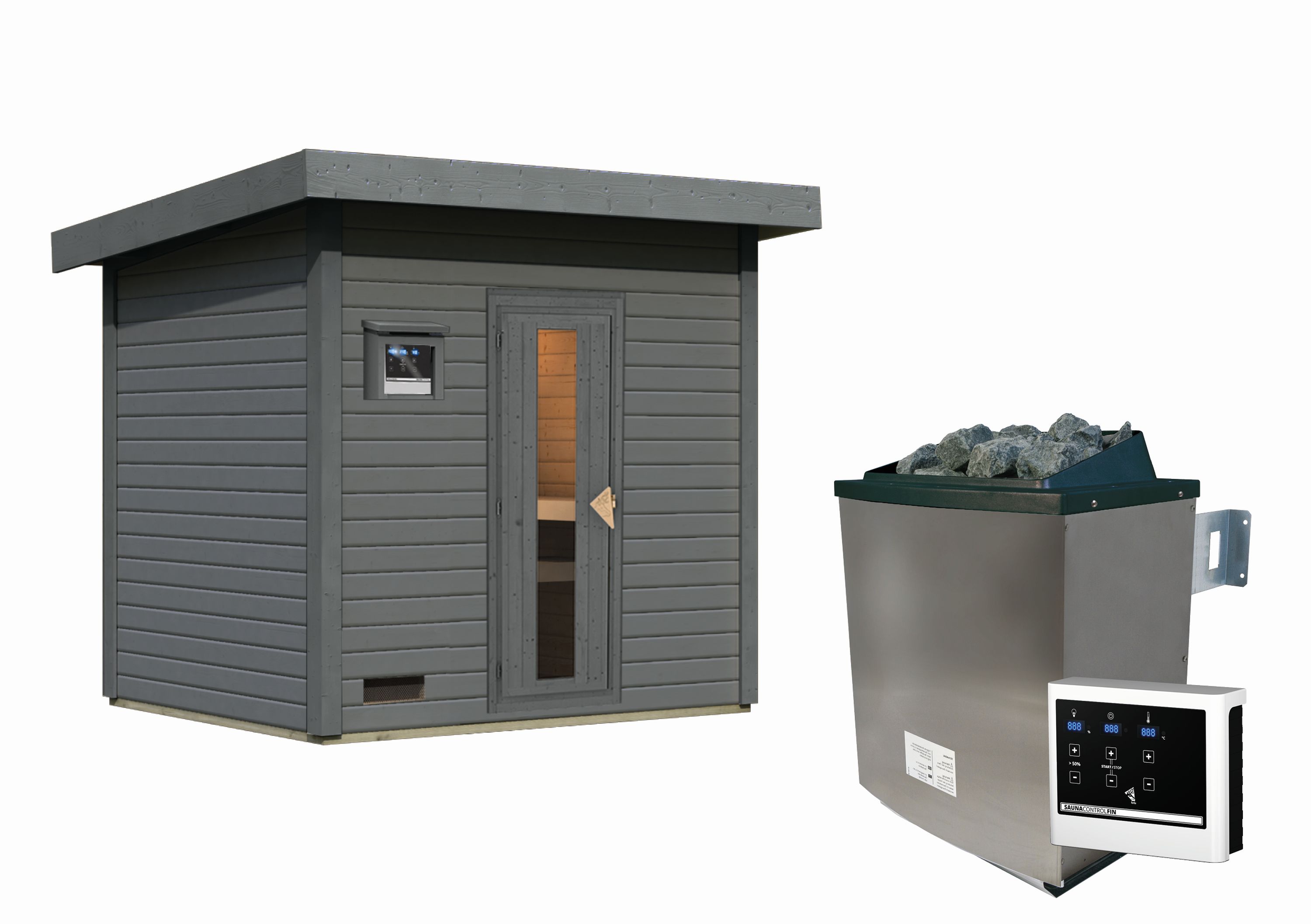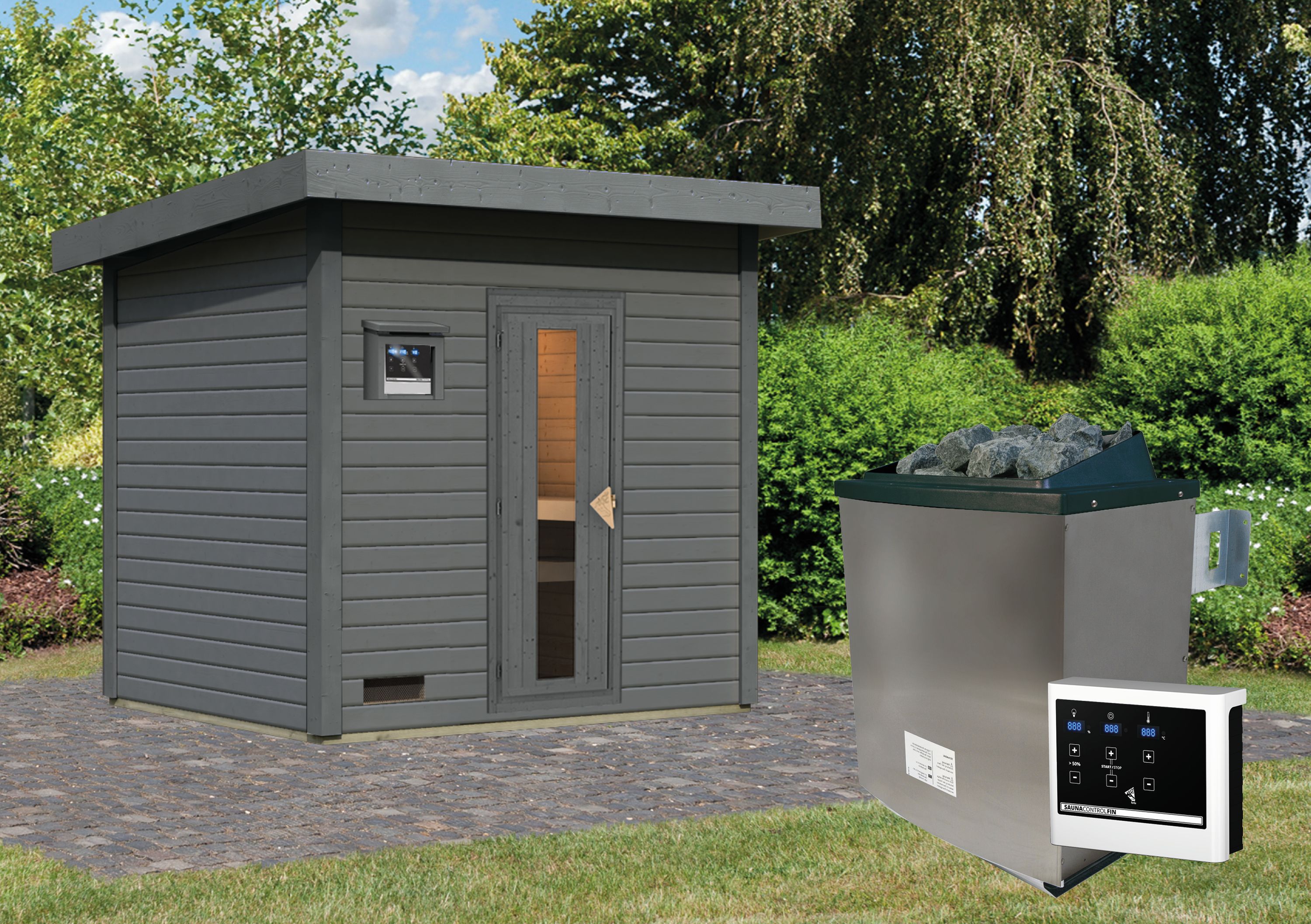 Saunieren nach dem Vorbild der Finnen. Mit dem Saunahaus Hytti 3 ist dies im eigenen Garten möglich. So ist das typische Eis- oder Schneebaden nach dem Saunagang zumindest im Winter durchaus möglich. Sollten Sie sogar einen See vor dem Haus haben, können Sie auch diesen nutzen, um sich abzukühlen. Das Saunahaus Hytti 3 bietet mit einem Außenmaß von 231 x 196 x 228 cm genügend Raum zum Entspannen. Nach einem stressigen Arbeitstag sich in den eigenen Garten zurückziehen und in der Außensauna entspannen oder den Urlaubstag im Garten mit einem ausgiebigen Saunagang abrunden