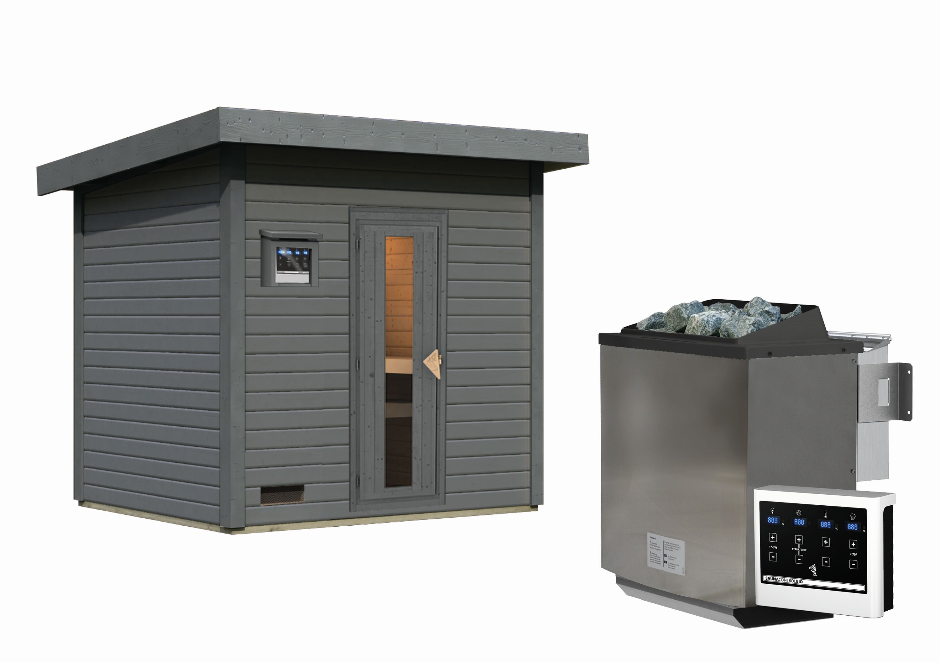 Das Saunahaus besteht aus 38 mm Massivholzbohlen aus nordischem Fichtenholz und wird im einfachen Steck- und Schraubsystem montiert. Es ist in klassischem Naturbelassen oder Terragrau lackiert erhältlich.