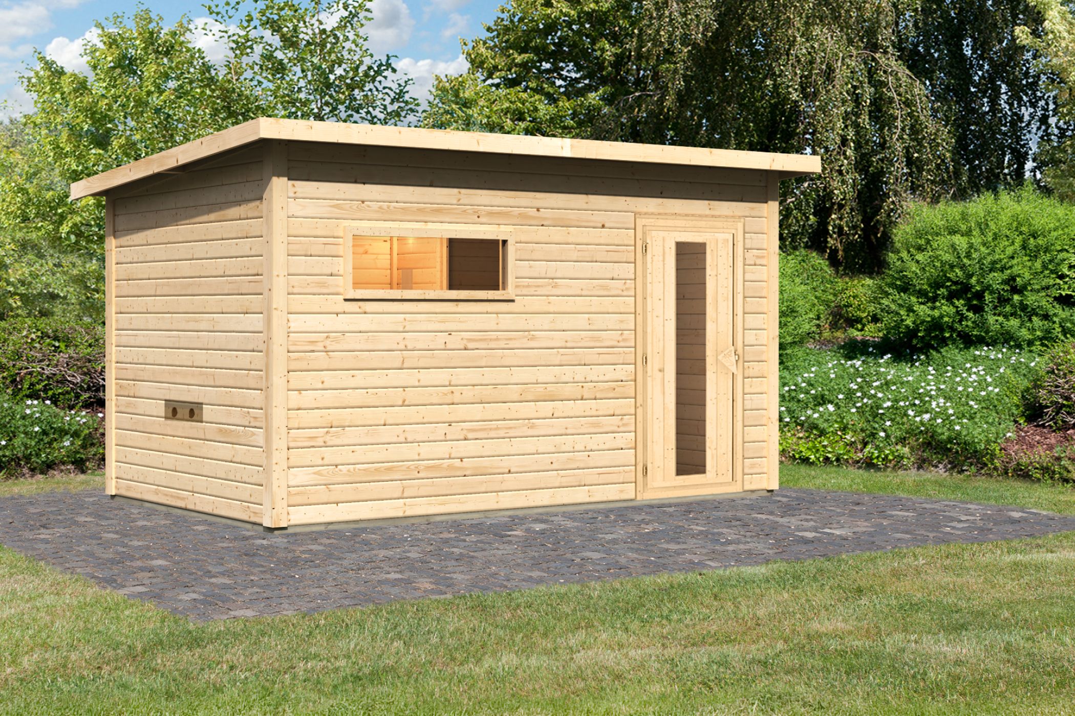 Das Außenmaß von 396 cm x 231 cm sorgt für ausreichende Platzverhältnisse bei Ihrem Saunagang. Unterstrichen wird dieses Maß von den Abmessungen des Saunaraums mit 219,5 cm x 184,5 cm. Für die nötige Entspannung sorgen 3 Saunabänke. Von wegen innere Werte: auch von außen punktet unser Saunahaus mit Qualität und durchdachten Lösungen. Das hochwertige Pultdach aus Massivholz sorgt dafür, dass Sie in der Sauna auch langfristig einen kühlen Kopf bewahren können. Das Thema konstruktiver Holzschutz wird mit einem Dachüberstand von 75 / 105 / 55 ausreichend berücksichtigt. So bleiben Türen und Wandbretter optimal geschützt. Unterhalb des Hauses sorgen unsere kesseldruckimprägnierten Bodenbalken in Verbindung mit dem mitgelieferten Massivholzboden für ausreichenden Schutz vor Staunässe oder aufsteigender Feuchtigkeit.
