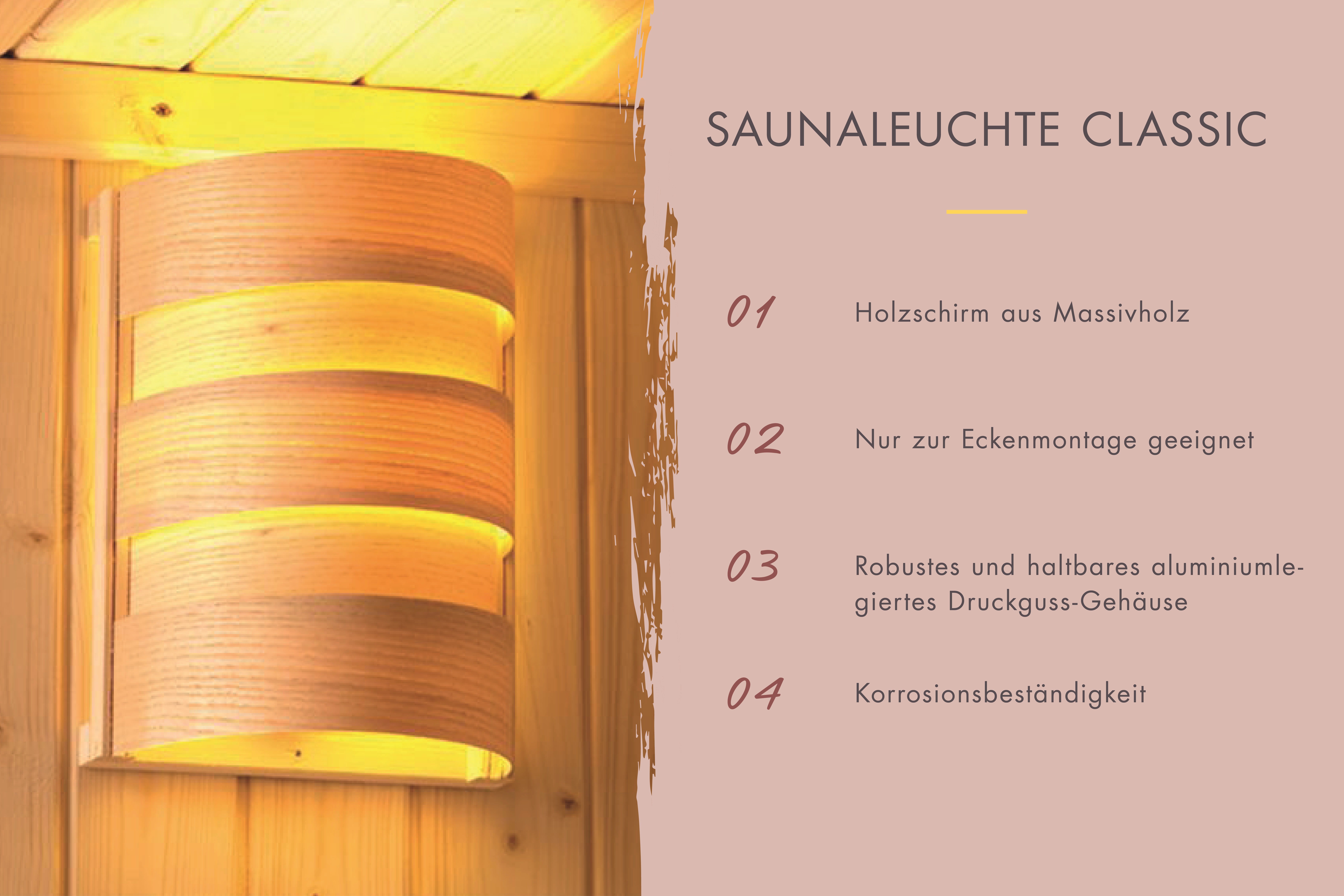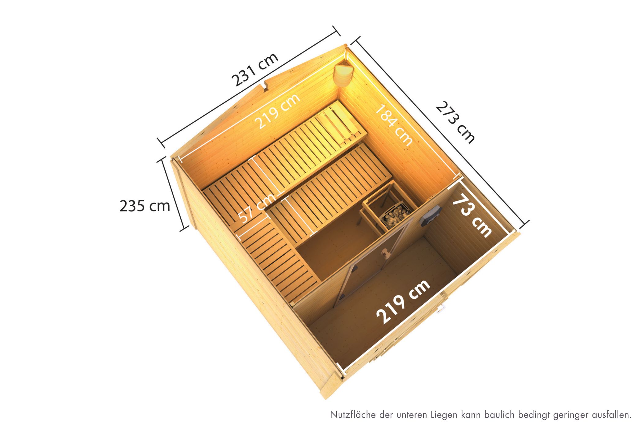 Das Saunahaus besteht aus 38mm starken Massivholzbohlen aus nordischer Fichte und wird im einfachen Steck- und Schraubsystem montiert, welches eine schnelle Montage des Saunahauses ermöglicht. Der Saunainnenraum verfügt über 3 Saunaliegen aus Espenholz, welche für ein besonders angenehmes Sitz- und Liegegefühl sorgen. Durch unser optional erhältliches Zubehör, wie die Kopfstütze-Premium, eine ergonomische Rückenlehne oder ein LED-Farblicht, können Sie Ihre Sauna nach Belieben ausstatten. Schaffen Sie sich ganz einfach Ihre persönlich perfekte Wellness-Oase. Abgetrennt werden die Räume durch eine bronzierte Ganzglastür mit Einscheibensicherheitsglas. Das Dach besteht aus Massivholz und wird im Saunabereich durch eine Rahmenkonstruktion mit Mineralwolldämmung verstärkt. So kann keine Wärme aus der Saunakabine entweichen.