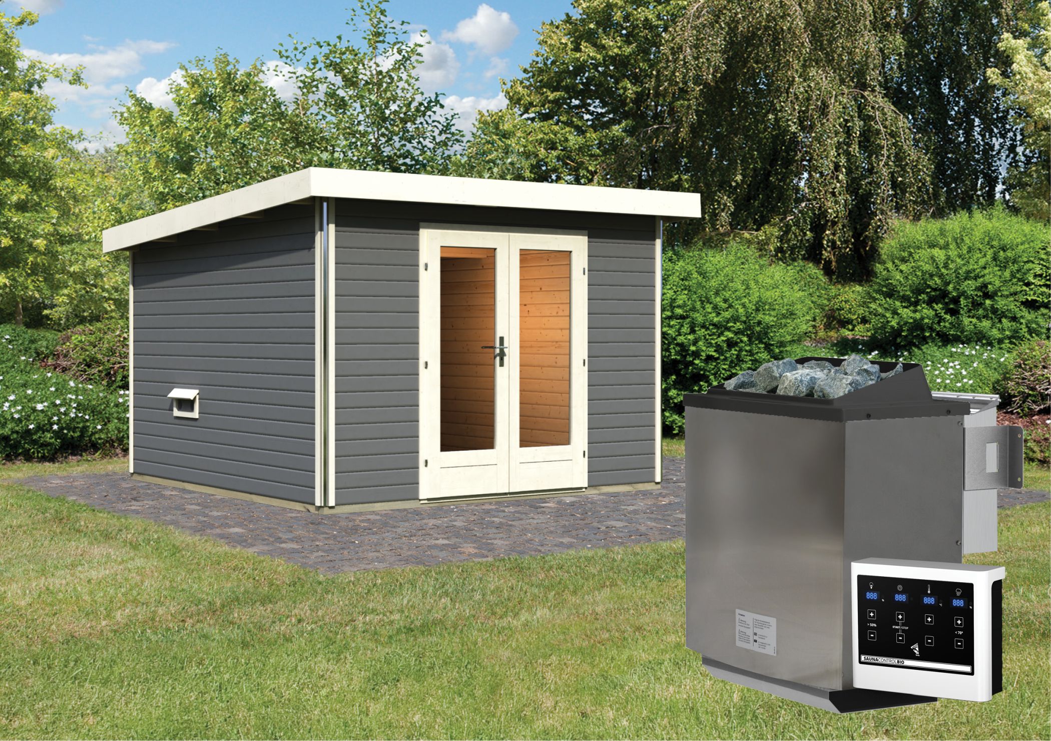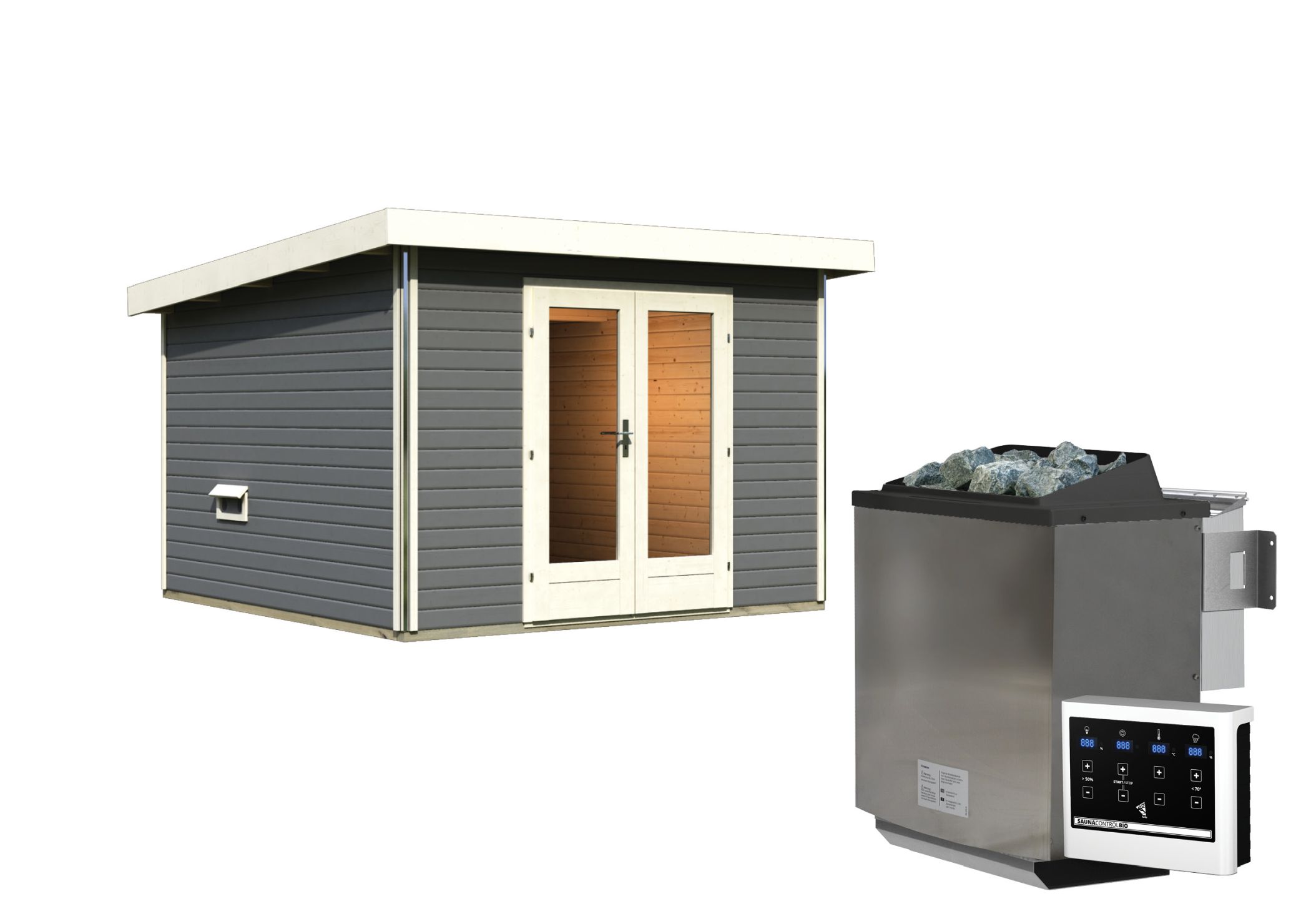 Das Saunahaus hat eine Wandstärke von 38 mm und wird mittels Steck- und Schraubsystem miteinander verschraubt. Es hat ein Außenmaß von 309 x 309 cm und eine Höhe von 229 cm. Es wird durch eine extra hohe Glas-Doppelflügeltür mit Zylinderschloss betreten. Für eine moderne Optik hat das Saunahaus an den Kanten eine Chromeline-Eckverbindung, so werden Kanten optimal verdeckt.