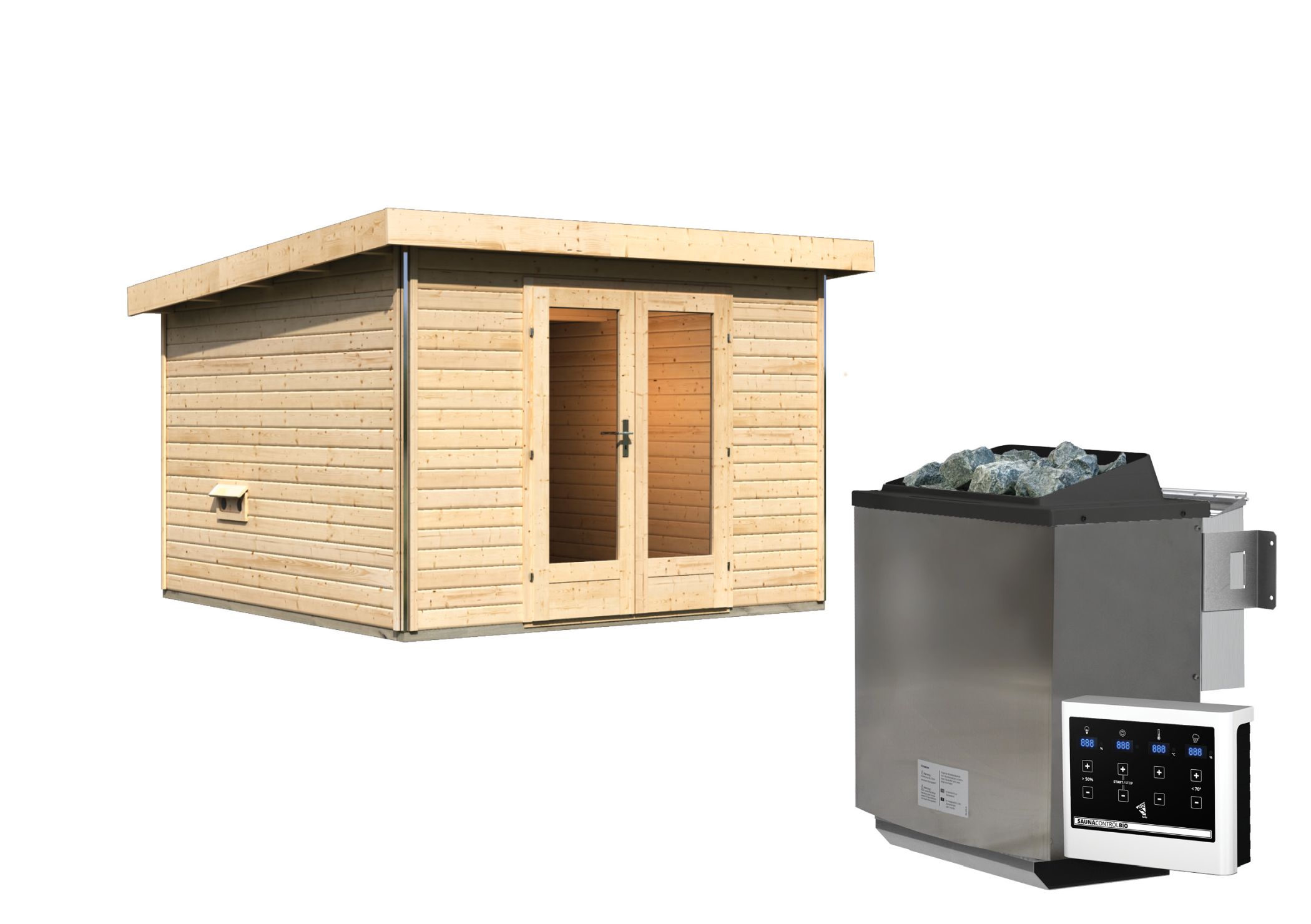 Das Saunahaus hat eine Wandstärke von 38 mm und wird mittels Steck- und Schraubsystem miteinander verschraubt. Es hat ein Außenmaß von 309 x 309 cm und eine Höhe von 229 cm. Es wird durch eine extra hohe Glas-Doppelflügeltür mit Zylinderschloss betreten. Für eine moderne Optik hat das Saunahaus an den Kanten eine Chromeline-Eckverbindung, so werden Kanten optimal verdeckt.
