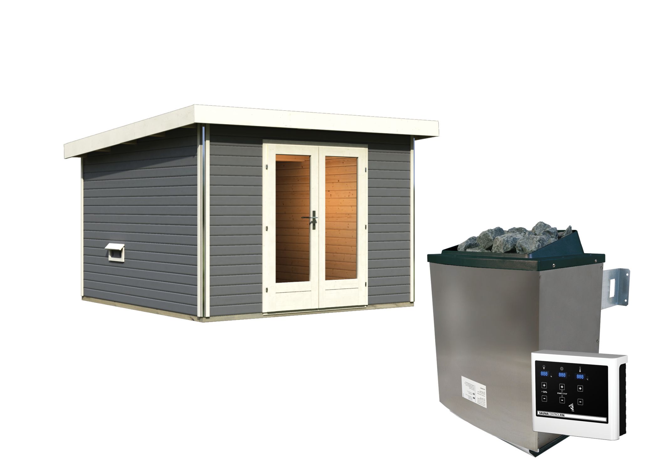 Das Saunahaus hat eine Wandstärke von 38 mm und wird mittels Steck- und Schraubsystem miteinander verschraubt. Es hat ein Außenmaß von 309 x 309 cm und eine Höhe von 229 cm. Es wird durch eine extra hohe Glas-Doppelflügeltür mit Zylinderschloss betreten. Für eine moderne Optik hat das Saunahaus an den Kanten eine Chromeline-Eckverbindung, so werden Kanten optimal verdeckt.