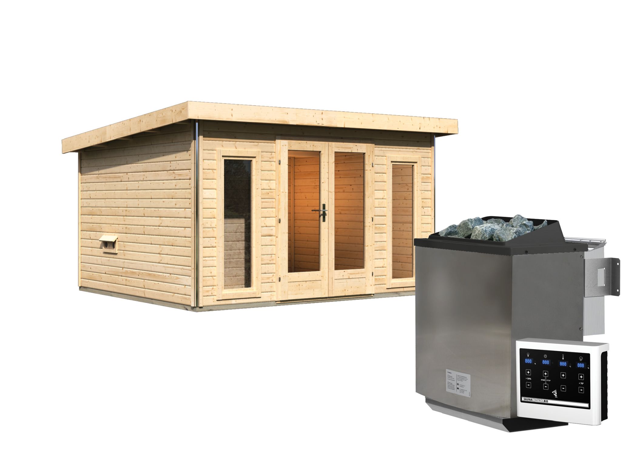 Das Saunahaus hat eine Wandstärke von 38 mm und wird mittels Steck- und Schraubsystem miteinander verschraubt. Es hat ein Außenmaß von 369 x 309 cm und eine Höhe von 229 cm. Es wird durch eine extra hohe Glas-Doppelflügeltür mit Zylinderschloss betreten. Für eine moderne Optik hat das Saunahaus an den Kanten eine Chromeline-Eckverbindung, so werden Kanten optimal verdeckt.