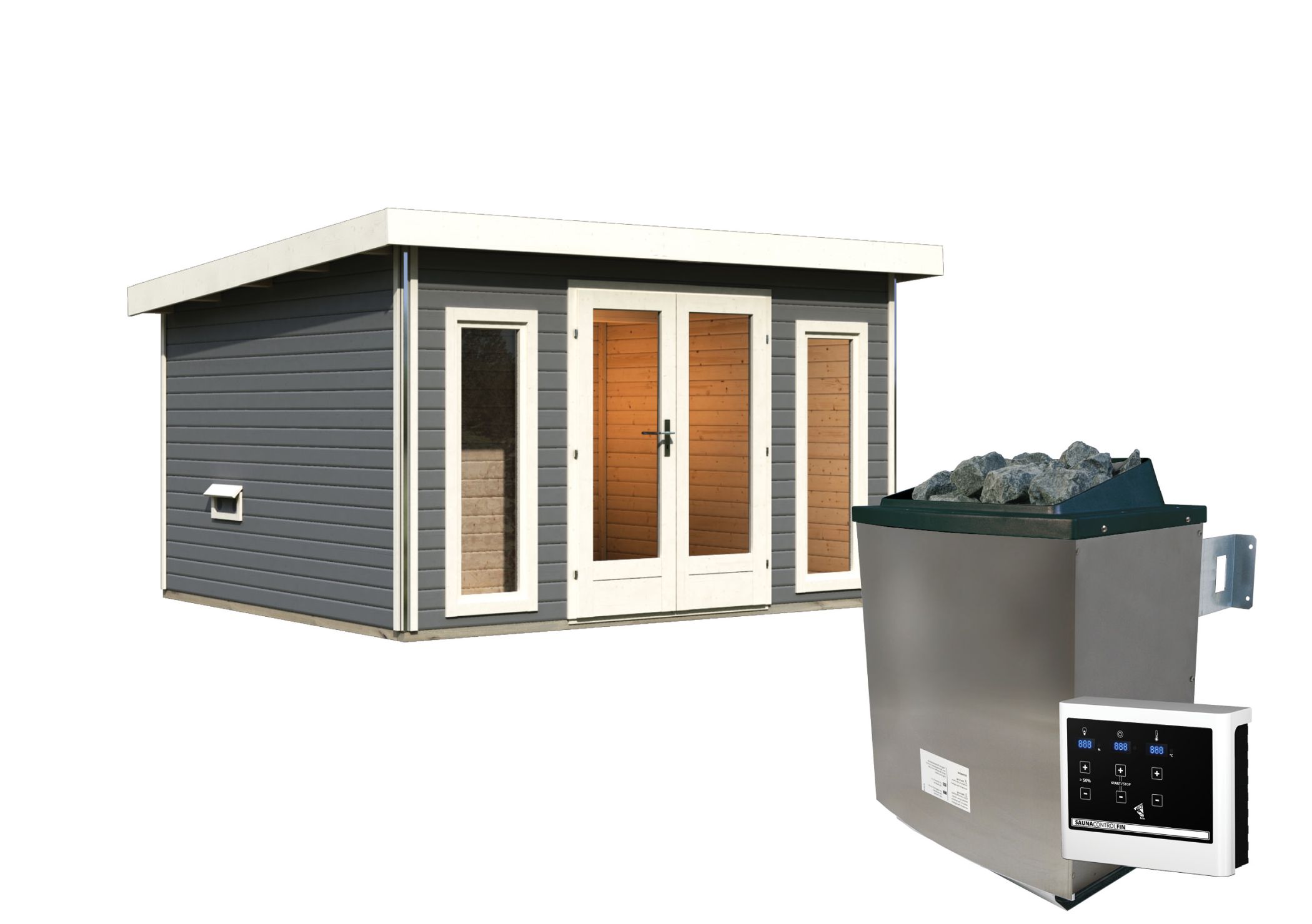 Das Saunahaus hat eine Wandstärke von 38 mm und wird mittels Steck- und Schraubsystem miteinander verschraubt. Es hat ein Außenmaß von 369 x 309 cm und eine Höhe von 229 cm. Es wird durch eine extra hohe Glas-Doppelflügeltür mit Zylinderschloss betreten. Für eine moderne Optik hat das Saunahaus an den Kanten eine Chromeline-Eckverbindung, so werden Kanten optimal verdeckt.