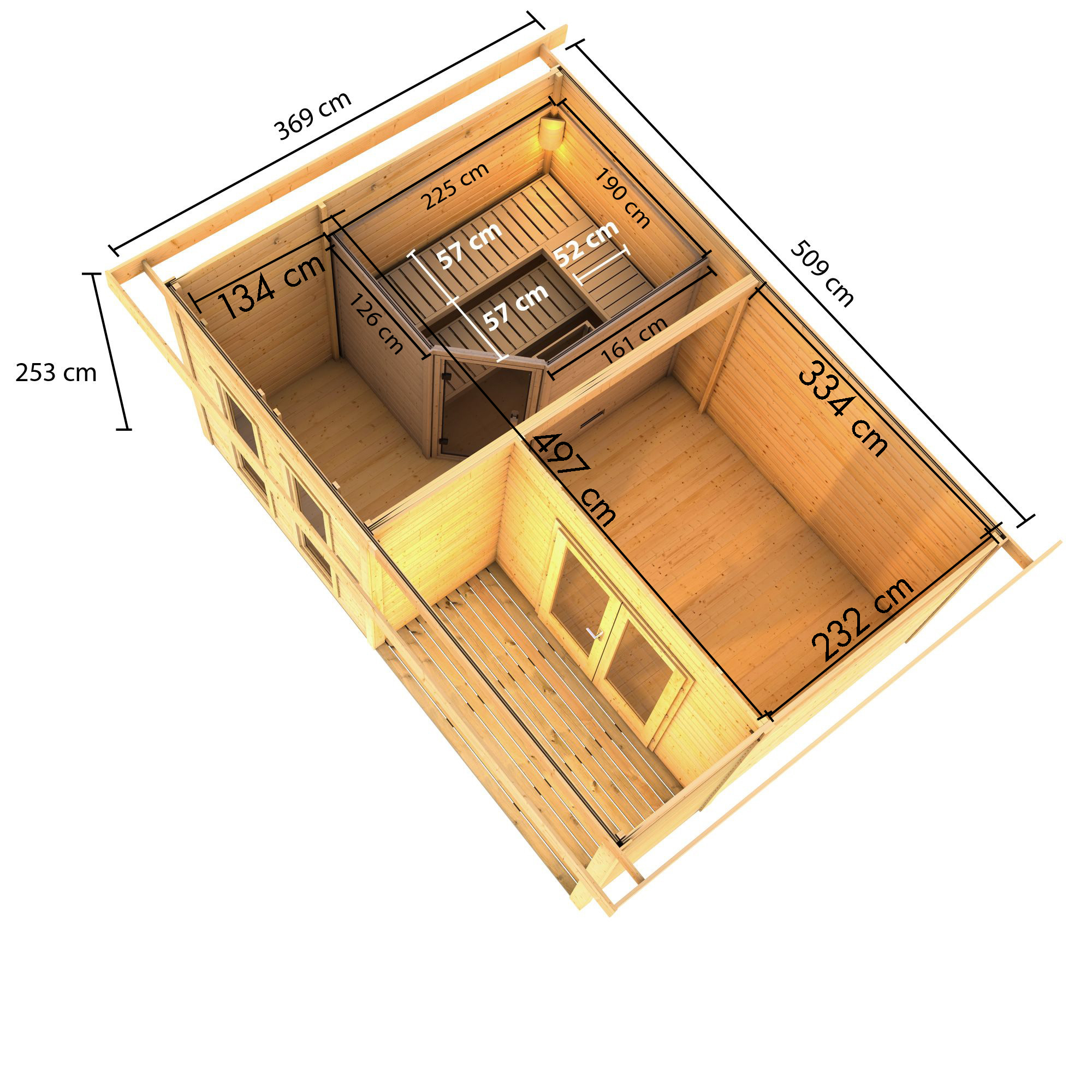 Das Saunahaus hat eine Wandstärke von 38 mm und wird mittels Steck- und Schraubsystem miteinander verschraubt. Es hat ein Außenmaß von 509 x 369 cm und eine Höhe von 253 cm. Es wird durch eine extra hohe Glas-Doppelflügeltür mit Zylinderschloss betreten.