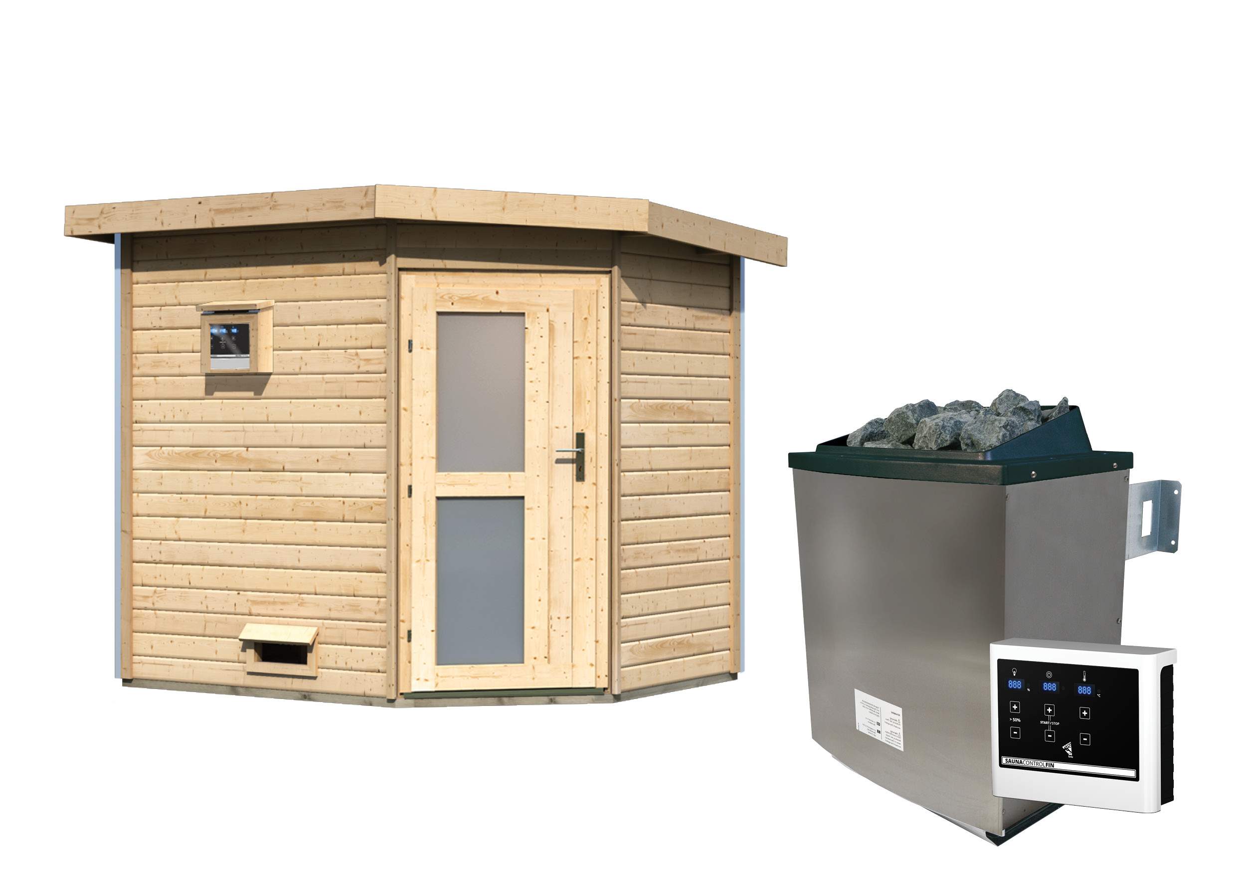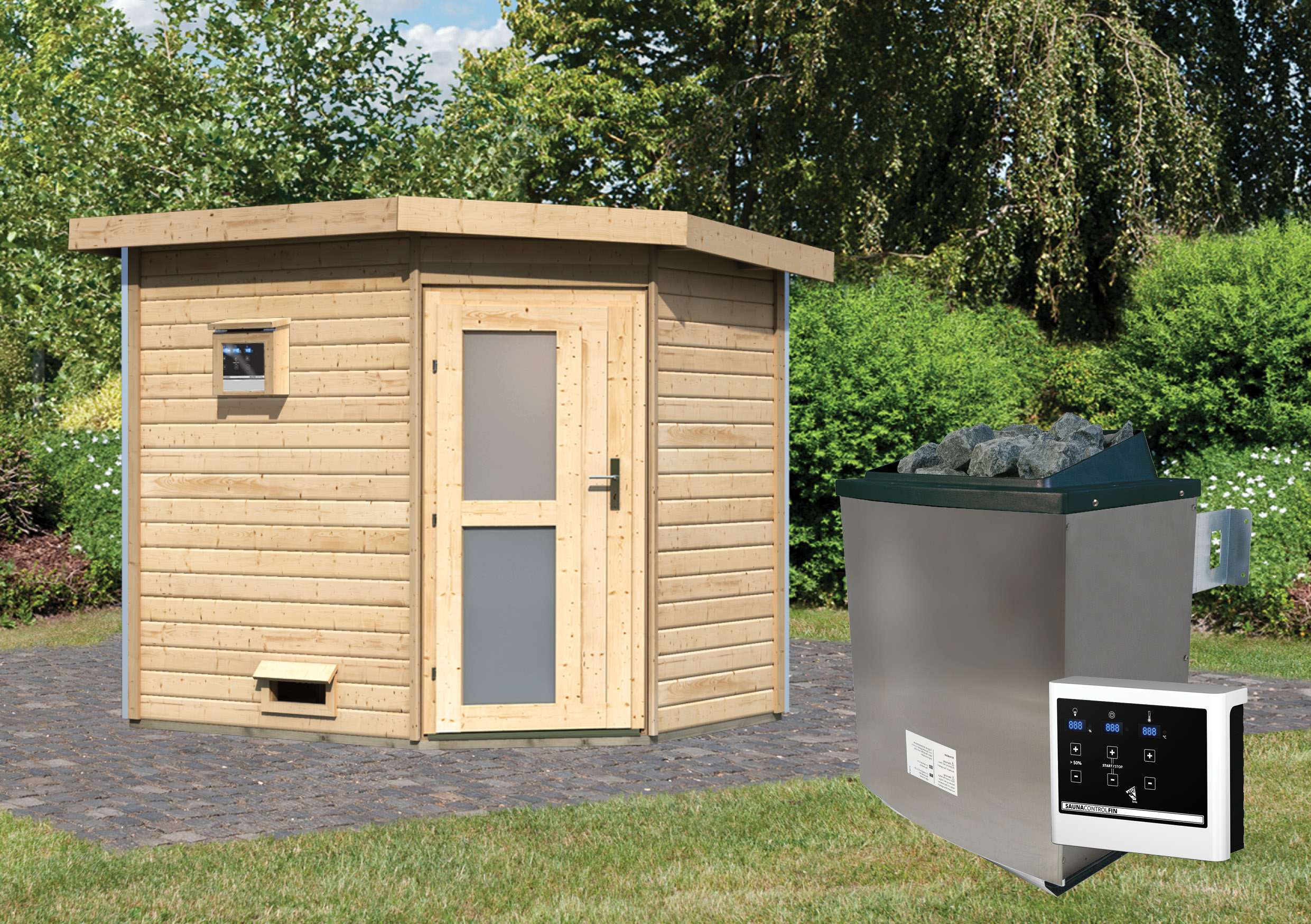 Das Saunahaus besteht aus 38mm Massivholzbohlen aus nordischem Fichtenholz und wird im einfachen Steck- und Schraubsystem montiert. Zum Schutz des Steuergerätes vor Nässe ist ein Steuergerät-Schutzkasten im Lieferumfang enthalten. Das schützende Pultdachhaus besteht aus Massivholz und bietet, ausgestattet mit einer optional erhältlichen selbstklebenden Dachfolie, den idealen Schutz vor der Witterung. Damit die Wärme im Inneren nicht entweichen kann, wird eine zweite Decke aus einer 42mm starken Rahmenkonstruktion mit Mineraldämmwolle eingezogen.