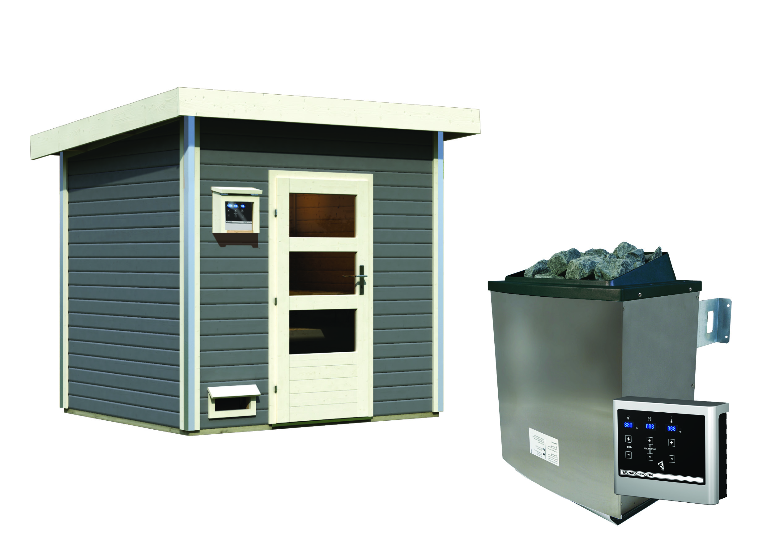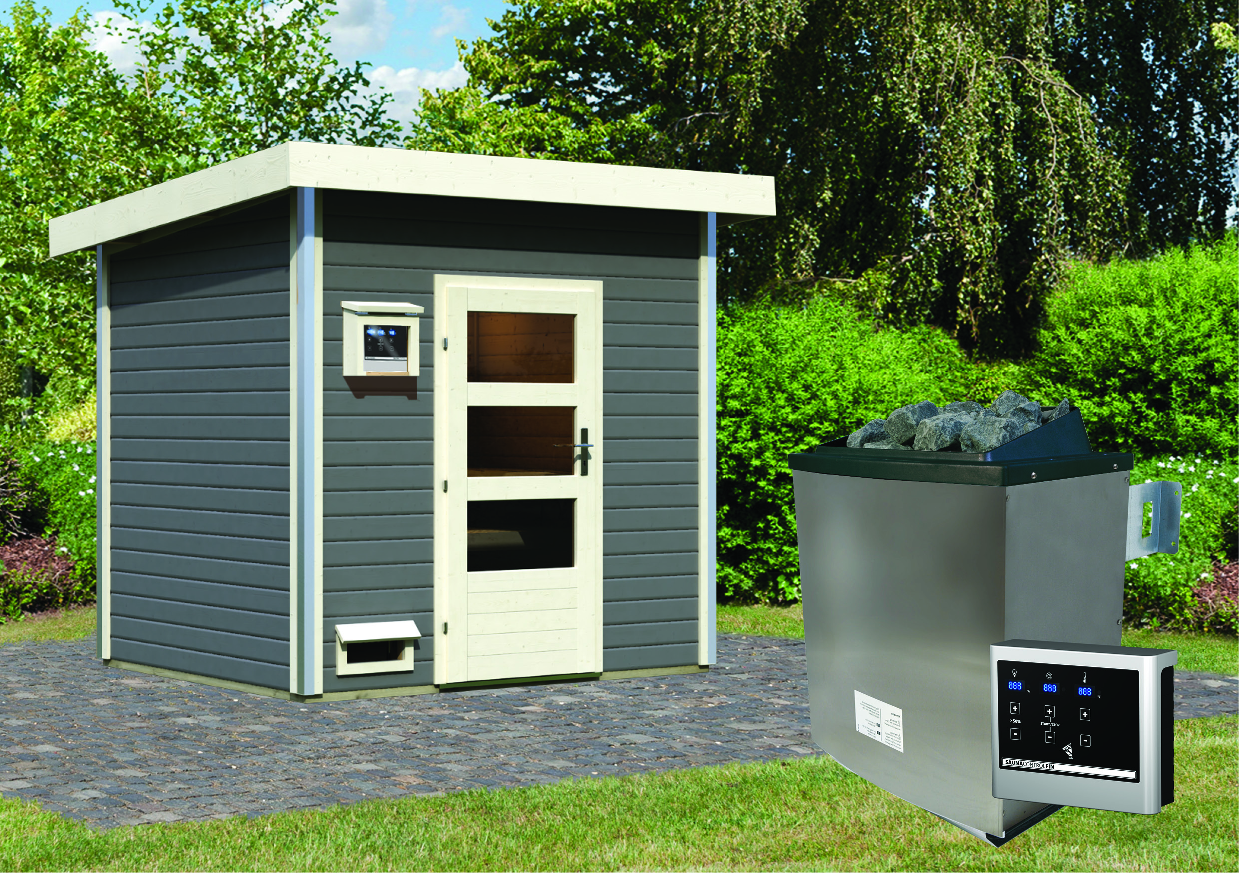 Das Saunahaus besteht aus 38mm Massivholzbohlen aus nordischem Fichtenholz und wird im einfachen Steck- und Schraubsystem montiert. Zum Schutz des Steuergerätes vor Nässe ist ein Steuergerät-Schutzkasten im Lieferumfang enthalten. Das schützende Pultdachhaus besteht aus Massivholz und bietet, ausgestattet mit einer optional erhältlichen selbstklebenden Dachfolie, den idealen Schutz vor der Witterung.