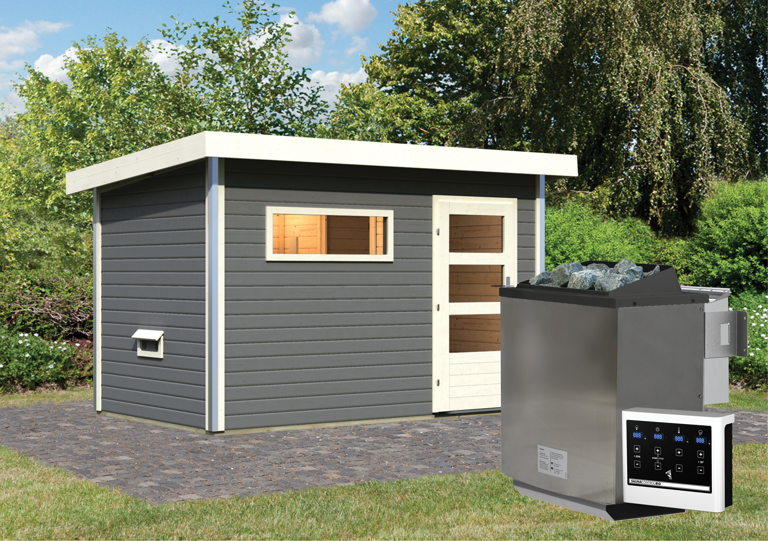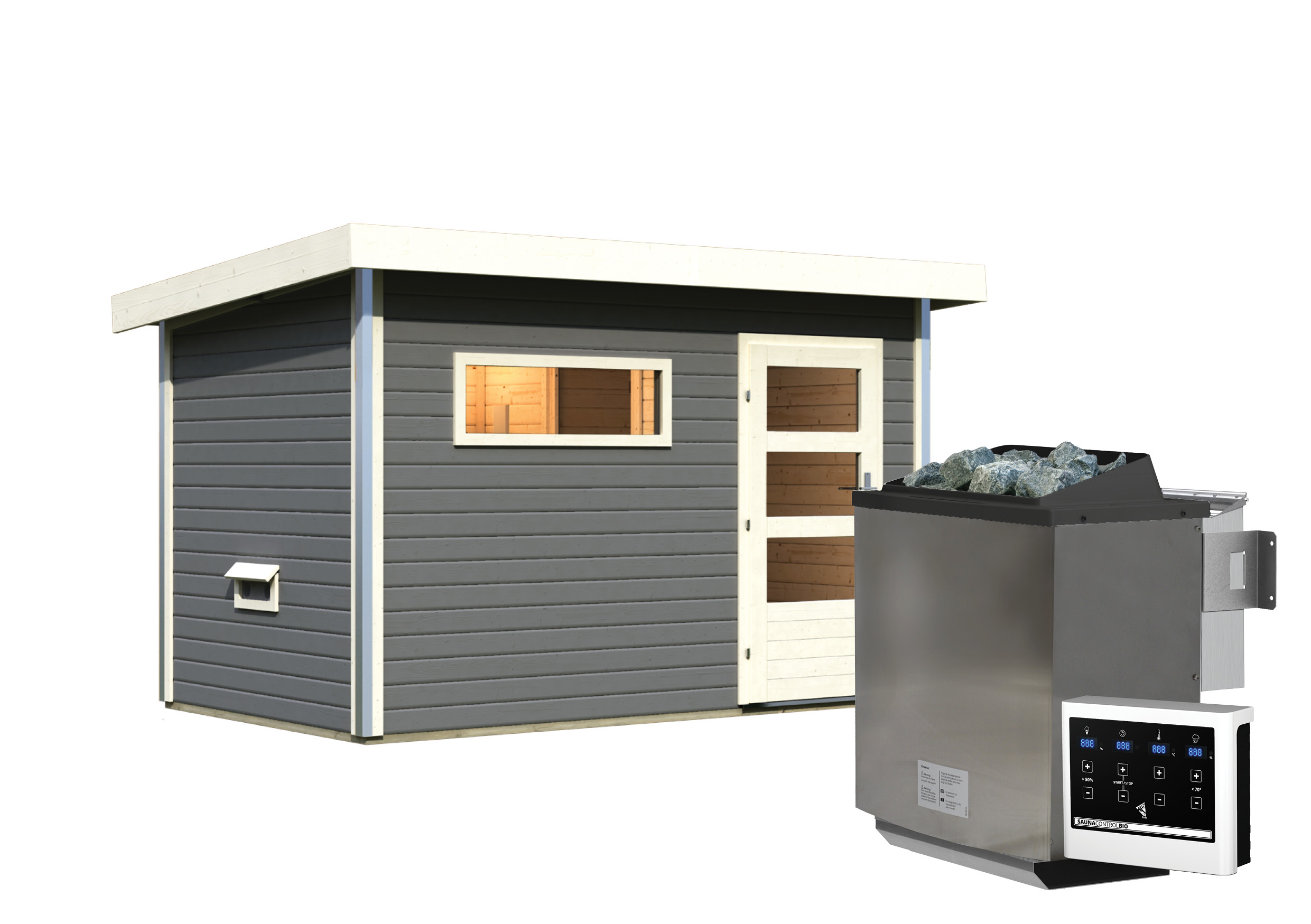 Karibu Gartensauna "Saunahaus Skrollan 1 mit Vorraum" 4 Personen Natur 9 kW Bio-Kombi Ofen + Steuergerät moderne Tür