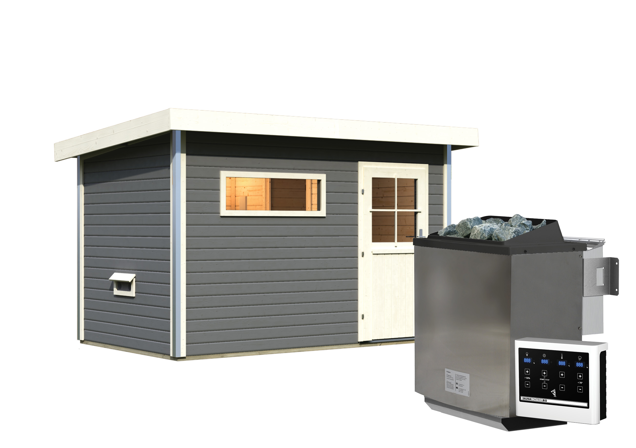 Karibu Gartensauna "Saunahaus Skrollan 1 mit Vorraum" 4 Personen Natur 9 kW Bio-Kombi Ofen + Steuergerät moderne Tür