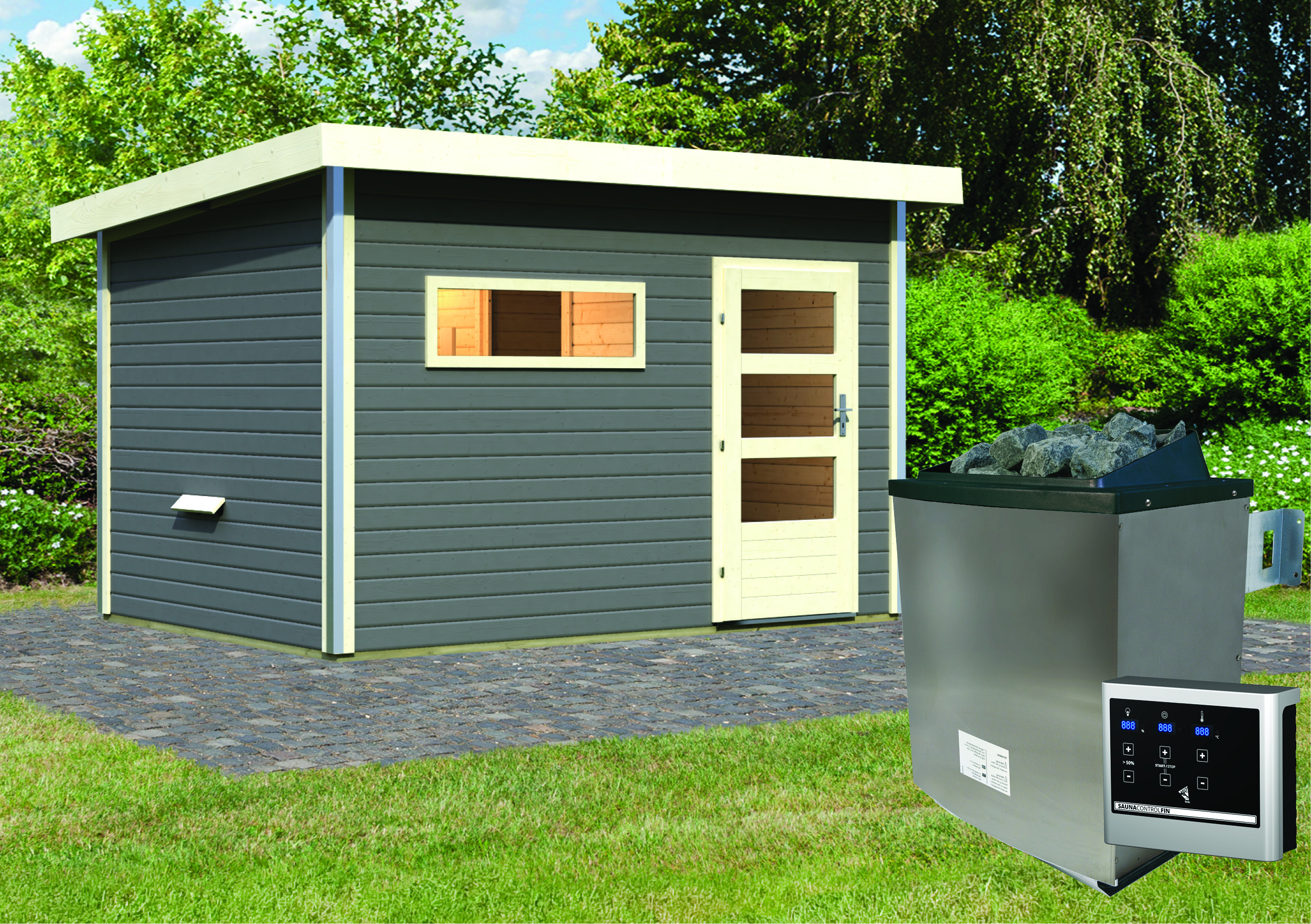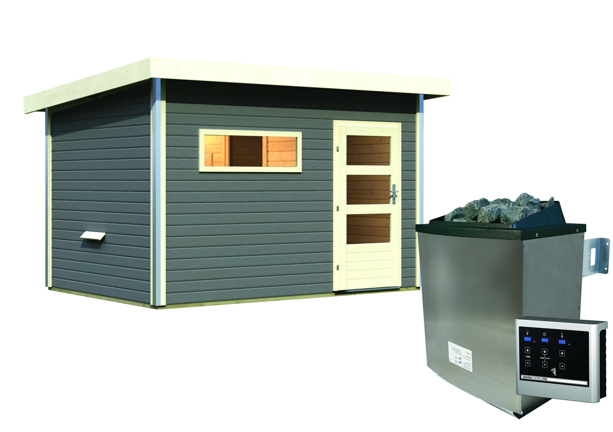 Das Saunahaus besteht aus 38mm starken Massivholzbohlen aus nordischer Fichte und wird im einfachen Steck- und Schraubsystem montiert, welches eine schnelle Montage des Saunahauses ermöglicht. Es ist in der modernen Farbe terragrau oder in dem klassischen naturbelassenen Holz erhältlich. Der Saunainnenraum verfügt über 2 Saunaliegen aus Espenholz, welche für ein besonders angenehmes Sitz- und Liegegefühl sorgen.