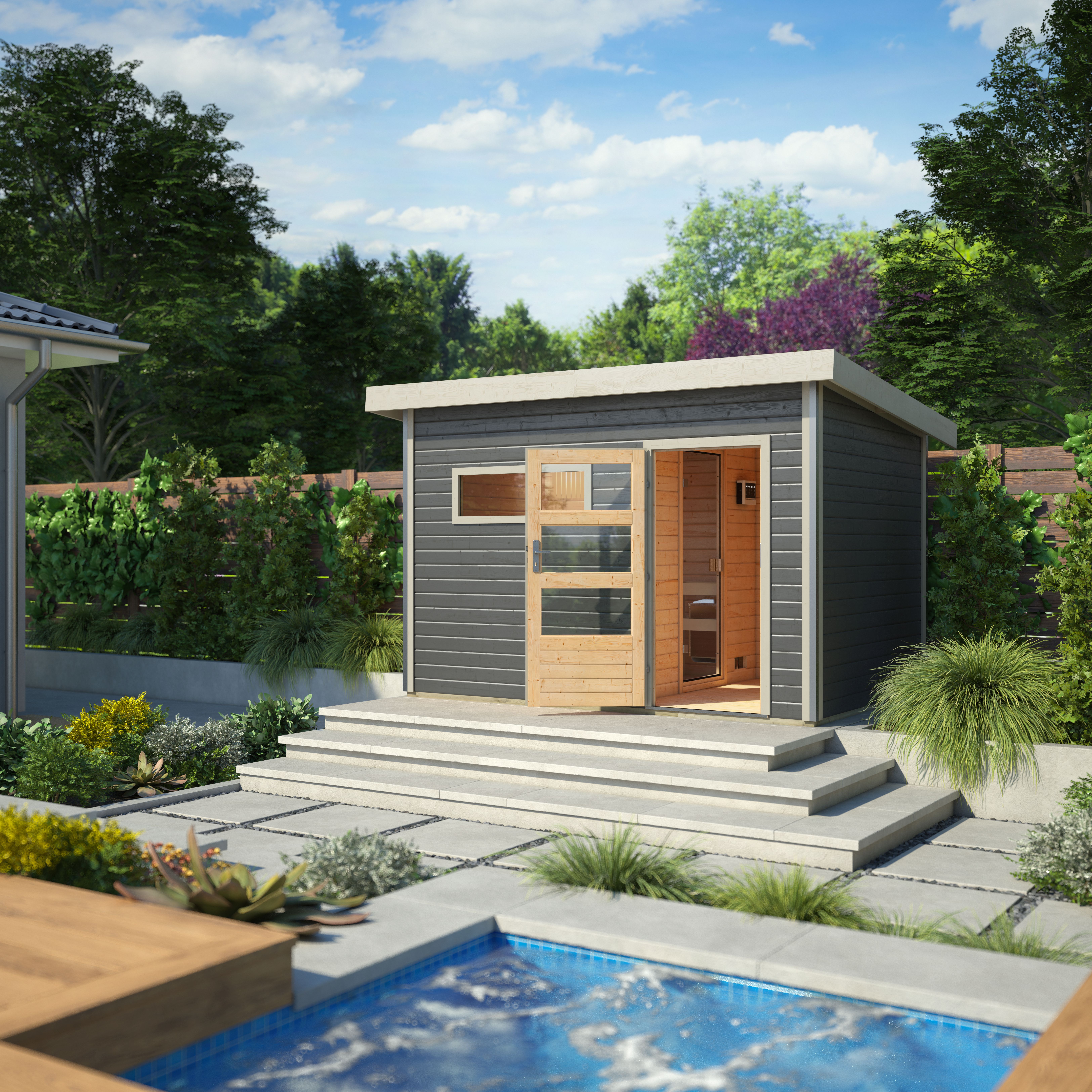 Nach dem Saunagang können Sie sich in dem großzügigen Vorraum entspannen oder sich durch den Sprung in den anliegenden Holzpool oder einem Schneebad im Winter abkühlen. Eine besondere Optik erhält die Außensauna durch die Chromeline-Eckverbindung, welche die unschönen Ecken perfekt kaschiert. Genießen Sie einen ausgiebigen Saunagang im eigenen Garten mit dem Saunahaus Skrollan 2 mit praktischem Vorraum.