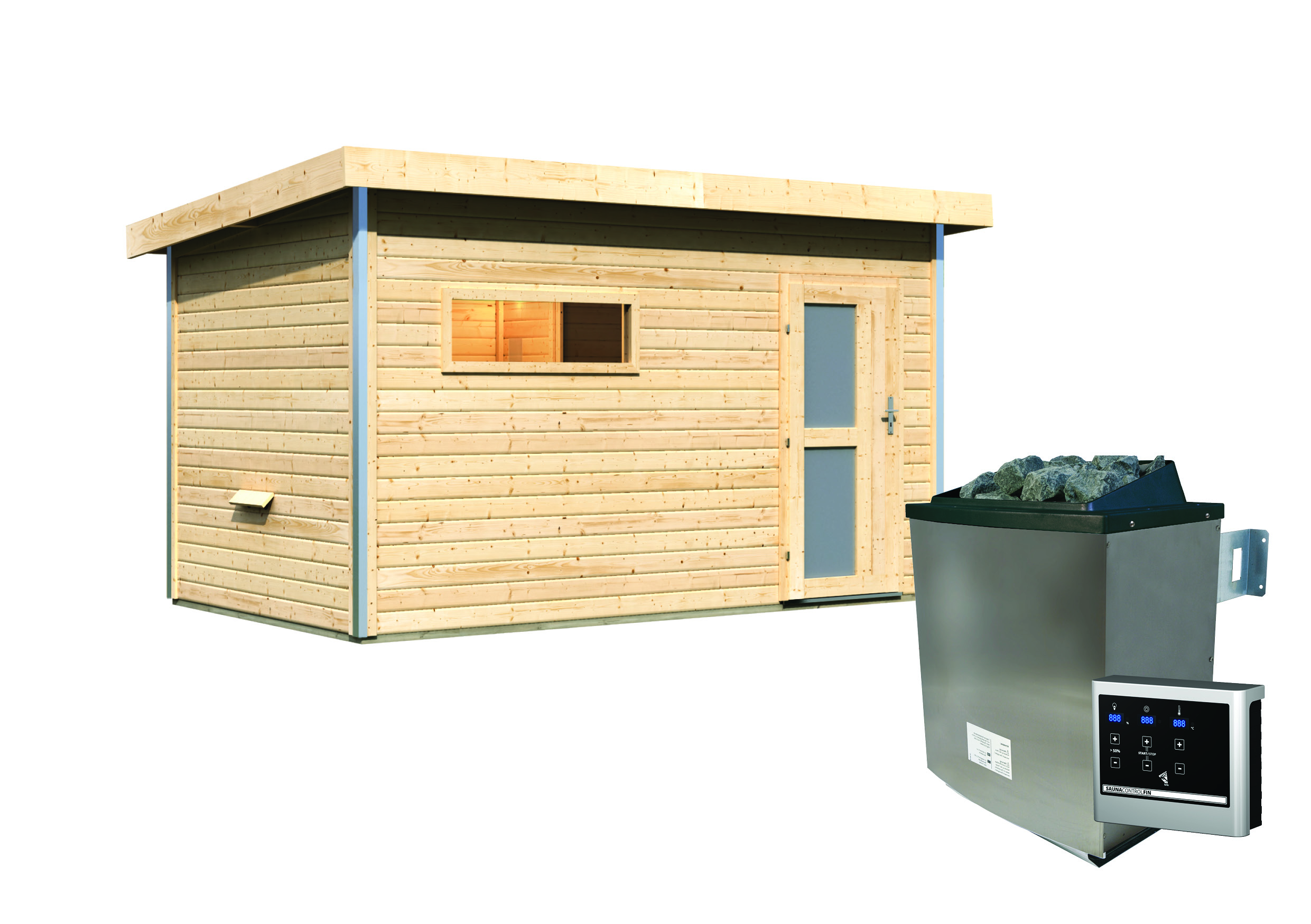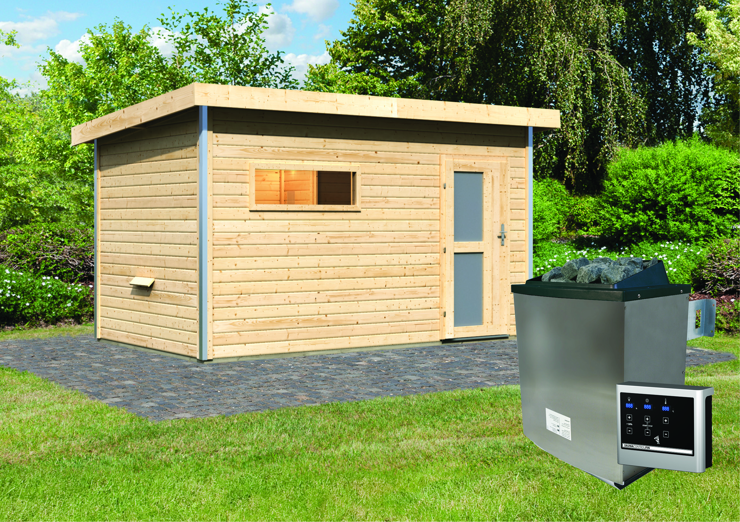 Mit einem Gesamtaußenmaß von 396 x 227 x 231 cm (B/H/T) schafft das Haus die nötige Fläche für eine Saunakabine zum Entspannen und einem praktischen Vorraum. Das Saunahaus besteht aus 38mm starken Massivholzbohlen aus nordischer Fichte und wird im einfachen Steck- und Schraubsystem montiert, welches eine schnelle Montage des Saunahauses ermöglicht. Es ist in der modernen Farbe terragrau oder in dem klassischen naturbelassenen Holz erhältlich.