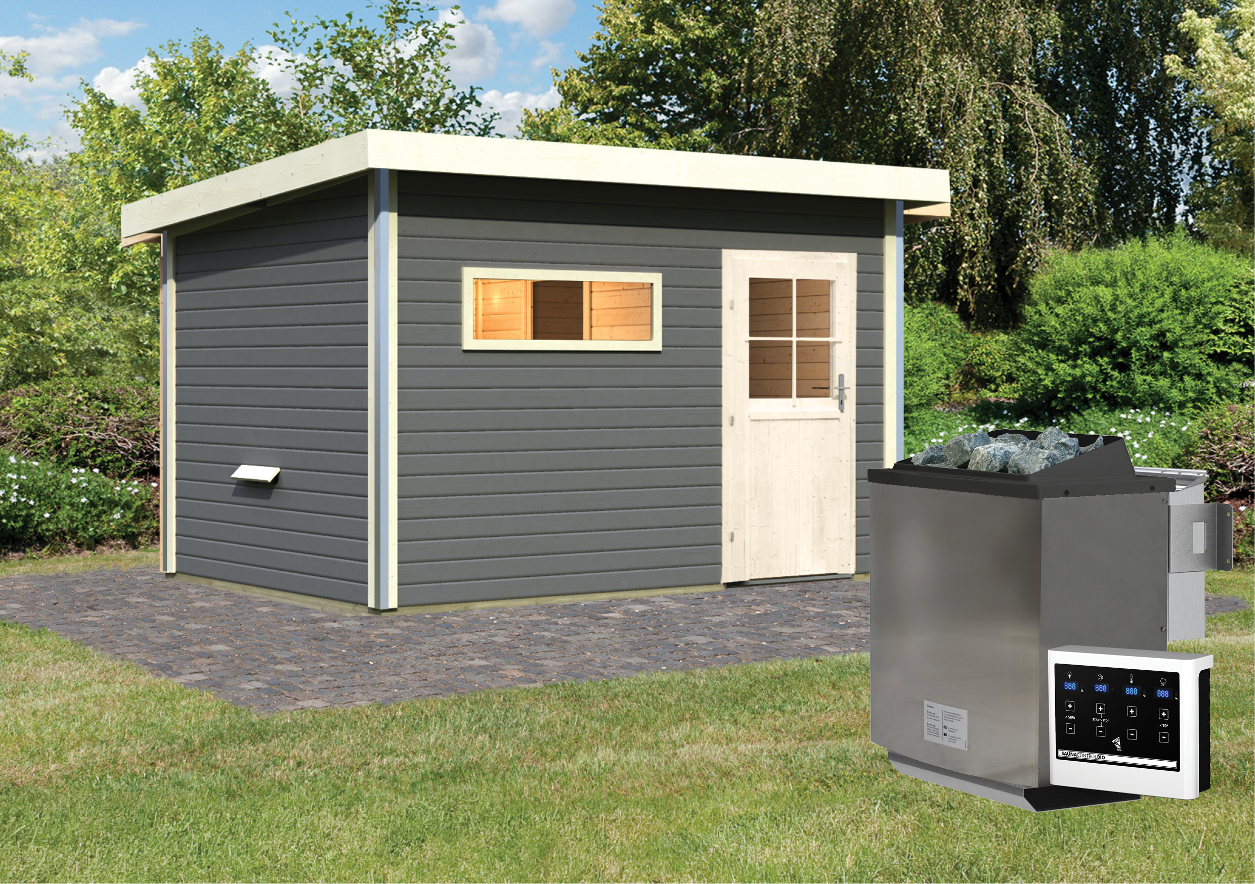 Sie möchten sich vor dem Saunieren in Ruhe in einem angrenzenden Raum entkleiden, sich nach dem Saunagang auf einem gemütlichen Stuhl entspannen oder zum Lagern der benötigten Accessoires nutzen? Diese und viele Vorteile bietet Ihnen die Außensauna Skrollan 3 mit Vorraum.