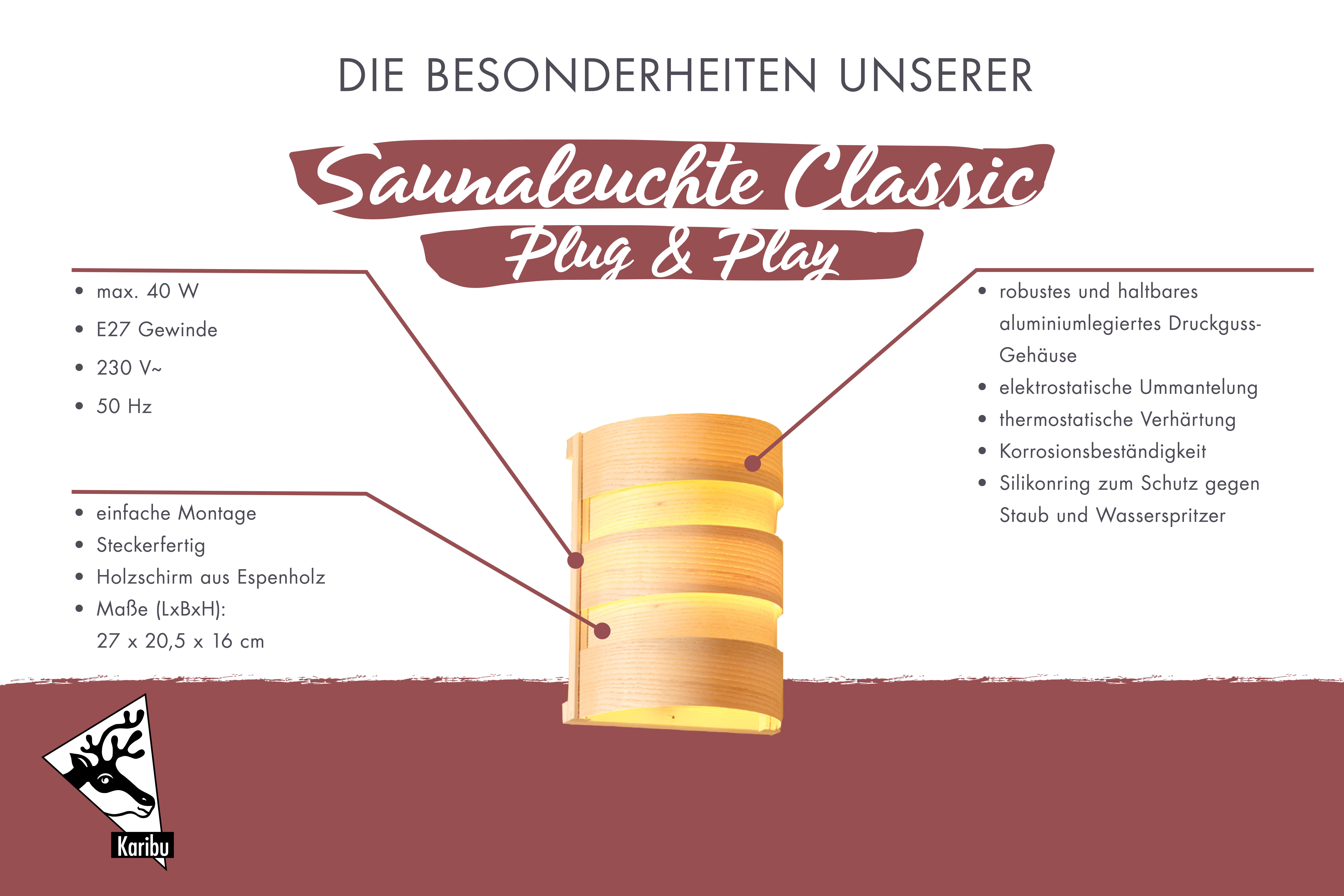 Schaffen Sie sich eine Atmosphäre zum Wohlfühlen und Entspannen Sie in Ihrer Sauna mit der Saunaleuchte Classic. Nicht nur eine schöne Ausstattung oder die Wärme in einer Sauna sorgen dafür, dass wir uns Entspannen können. Auch eine angenehme Lichtquelle trägt zu einem guten Wohlbefinden bei. Hierbei sollte das Licht nicht zu hell sein, damit ein gemütliches, ruhiges Ambiente entstehen kann. Andererseits sollte das Licht aber auch nicht zu Dunkel sein, um die Stimmung nicht zu trüben. Genau den Mittelweg schaffen Sie mit der Saunaleuchte Classic. Merkmale der Saunaleuchte Classic Die Saunaleuchte besteht aus einem Holzschirm aus Espenholz, der sich perfekt an die Inneneinrichtung der Sauna anpasst. Durch das dünne Holz wird das Licht in der gesamten Saunakabine verteilt und schafft zusätzlich ein warmes Ambiente. Die Leuchte besitzt eine Größe von (LxBxH) 27x20,5x16 cm und passt so in jede Karibu-Sauna. Die Saunaleuchte wird an der Saunawand montiert. Hierbei bleibt die Entscheidung der Platzwahl bei Ihnen. Entspannen Sie sich bei einem perfekten Lichtverhältnis mit der Saunaleuchte Classic.