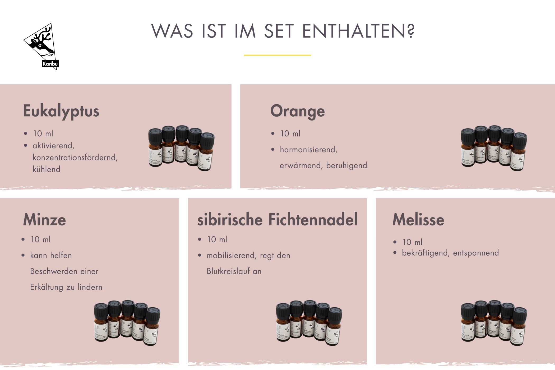 Düfte: Eukalyptus, Orange, Minze, Fichtennadel, Citrus-Limone