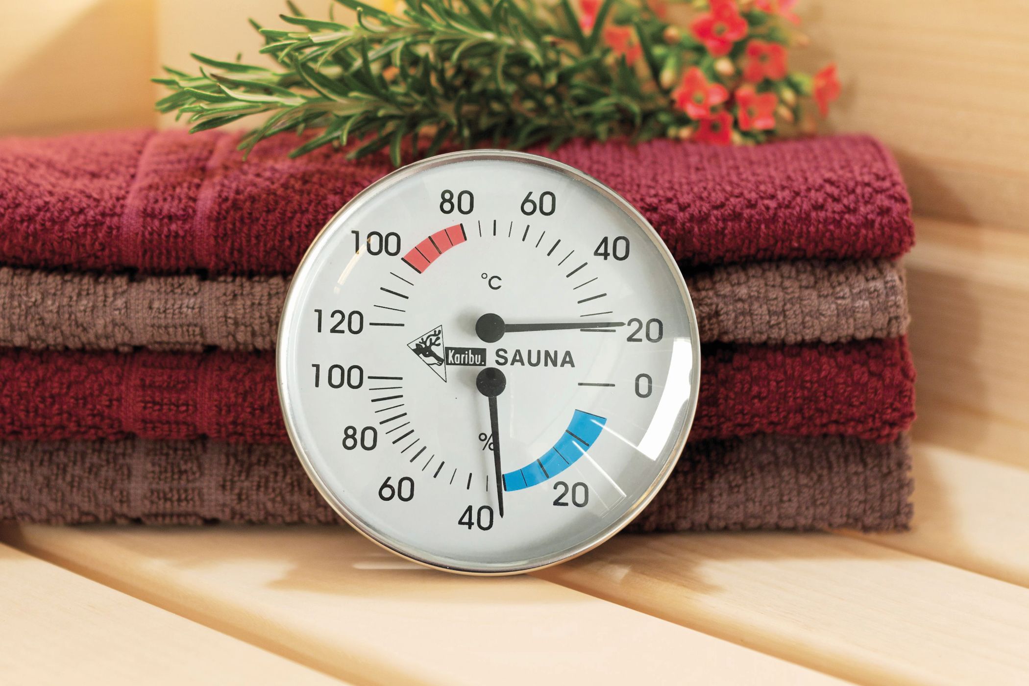 Der Klimamesser ermöglicht es Ihnen, die optimale Temperatur und Luftfeuchtigkeit in Ihrer Sauna zu überwachen und anzupassen.