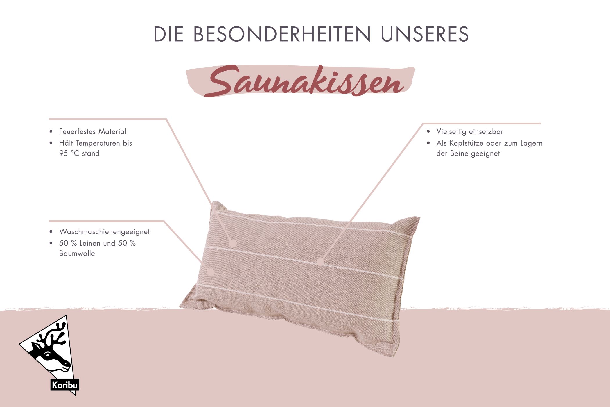Für einen extra Komfort während des Saunierens sorgt das Saunakissen. Dieses besteht aus feuerfestem und waschmaschinen-geeignetem Material. Es ist für Temperaturen bis zu 95°C geeignet. Der Bezug besteht zu 50% aus Leinen und zu 50% aus Baumwolle. Ob als Unterstützung im Rücken, als weiche Unterlage für den Kopf oder zum Hochlagern der Beine beim Liegen. Das Saunakissen kann vielseitig eingesetzt werden. Gestalten Sie sich Ihren Saunagang besonders bequem mit dem hochwertigen Saunakissen.
