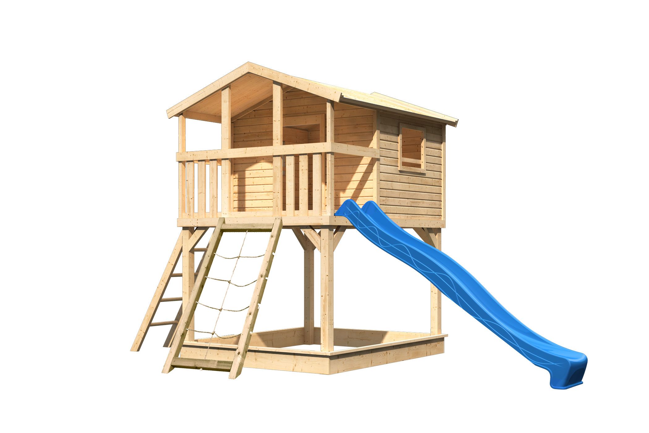 Dieses Stelzenhaus von Akubi & Karibu aus 19 mm starken Wandbrettern mit einer Podesthöhe von 150 cm beflügelt die Fantasie Ihrer Kinder. 4 Massivholzpfosten mit einer Stärke von 90 mm x 90 mm und Terrassen vor dem Haus mit Brüstung sorgen für viel Sicherheit für Ihre Kleinen. Im Lieferumfang ist eine Holzleiter enthalten, die den Zugang zur Terrasse vereinfacht, sowie ein integrierter Sandkasten für kreativen Spielspaß. Das Außenmaß dieses Hauses beträgt 198 cm x 244 cm x 309 cm und bietet somit unglaublich viel Platz um die Fantasie anzukurbeln. Das Haus wird mit einem Satteldach aus Massivholz geschützt. Die 6 m² große Dachfläche bietet auch der Terrasse noch Schutz und sorgt für unbeschwertes Spielvergnügen, egal zu welcher Jahreszeit. Unsere Stelzenhäuser bieten mit einer Rutsche in drei Farben sowie weiterem umfangreichem Zubehör alles, was das Kinderherz begehrt.