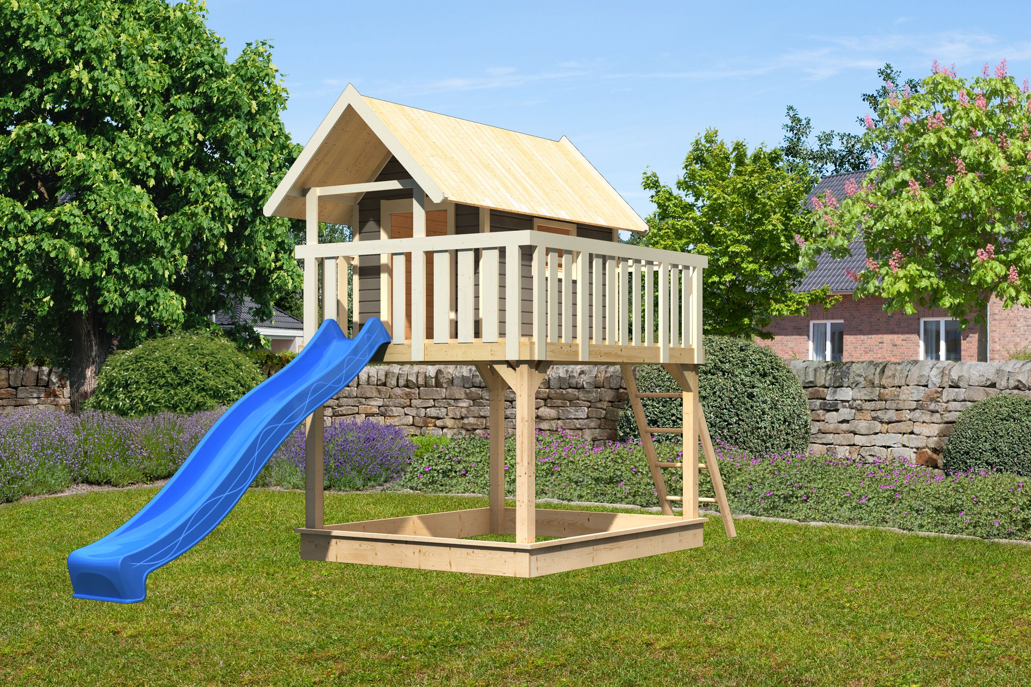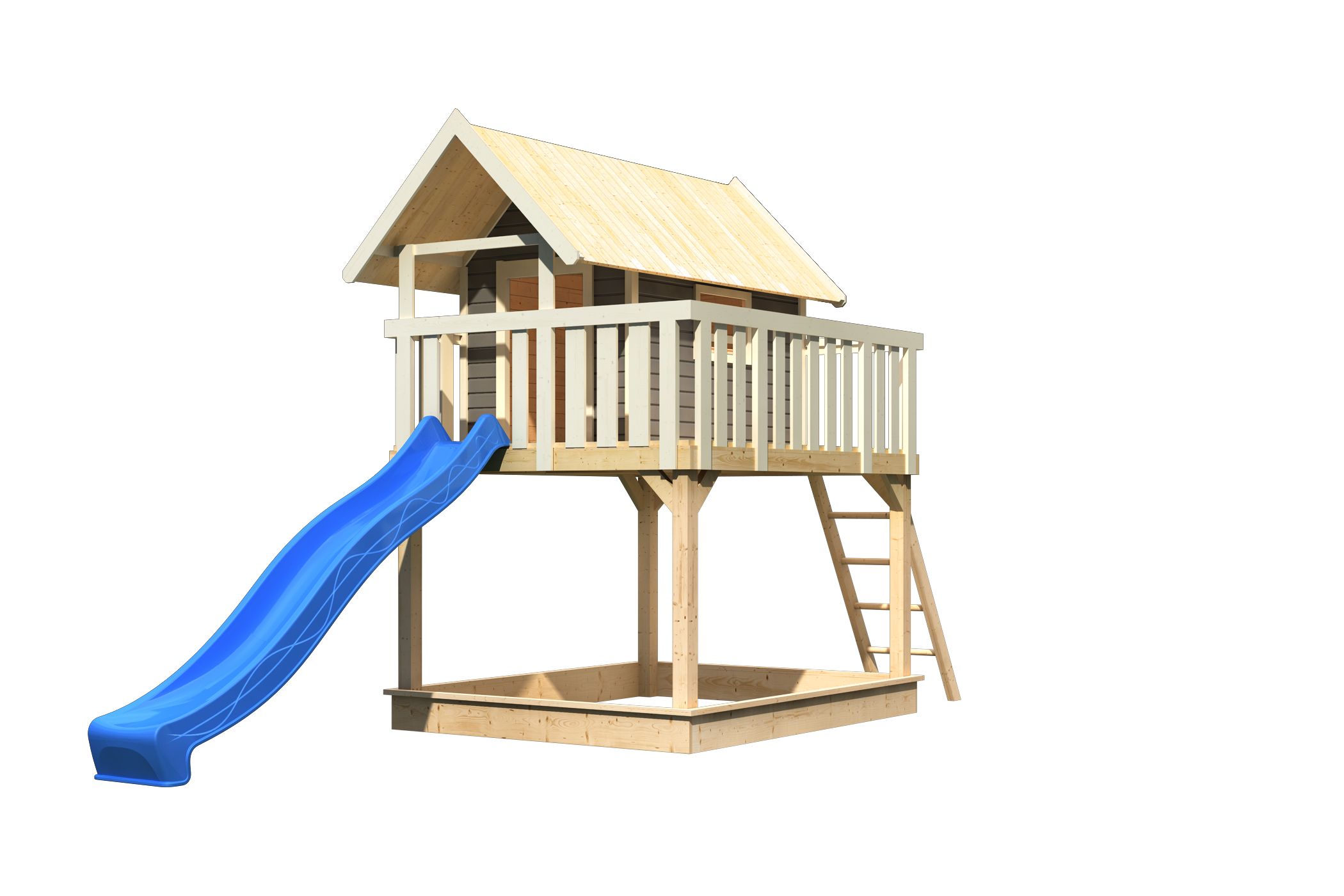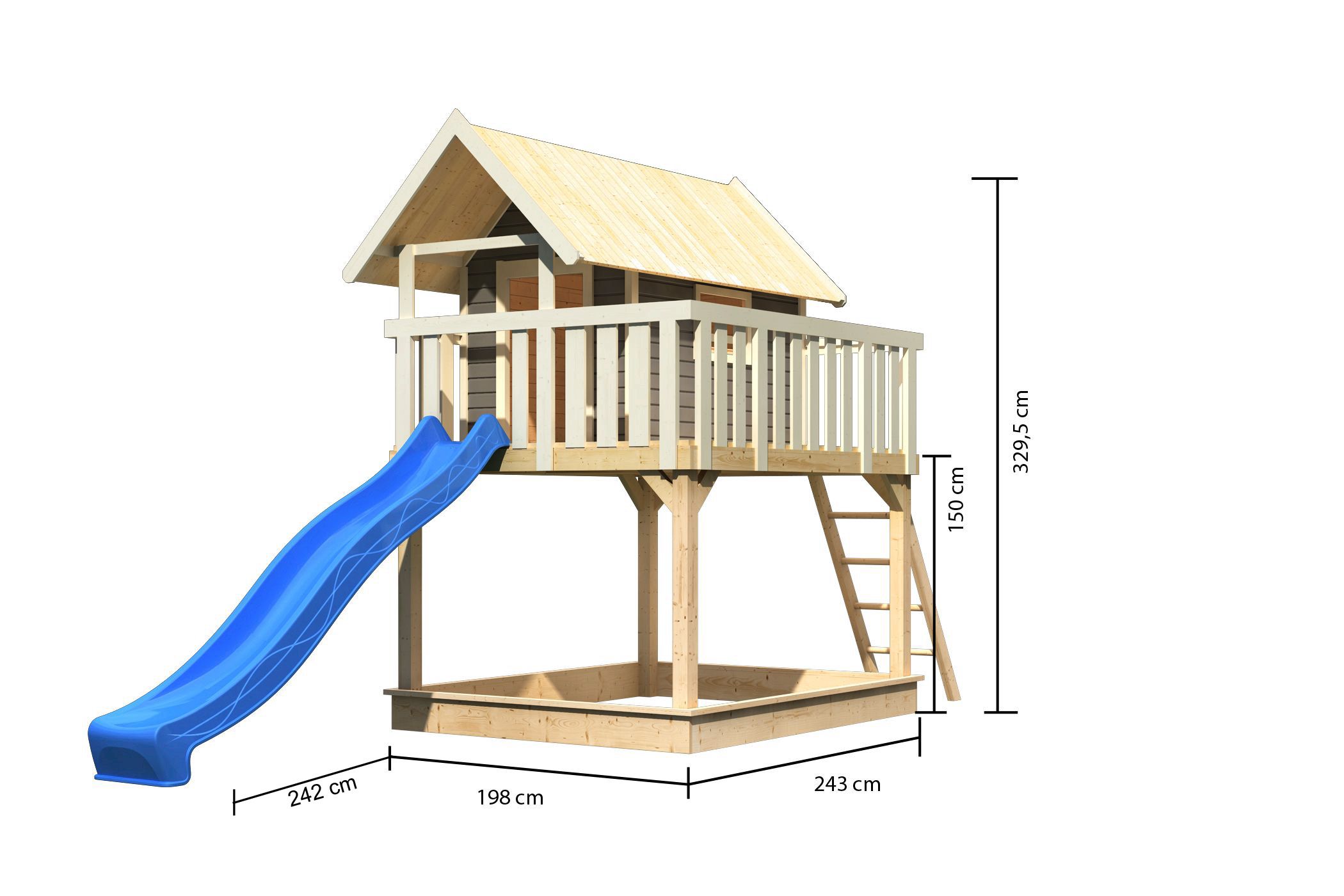 Dieses Stelzenhaus aus 19 mm starken Wandbrettern mit einer Podesthöhe von 150 cm beflügelt die Fantasie Ihrer Kinder. 4 Massivholzpfosten mit einer Stärke von 90 mm x 90 mm und Terrassen vor dem Haus mit Brüstung sorgen für viel Sicherheit für Ihre Kleinen. Im Lieferumfang ist eine Holzleiter enthalten, die den Zugang zur Terrasse vereinfacht. Das Außenmaß dieses Hauses beträgt 198 cm x 243 cm x 329,5 cm und bietet somit unglaublich viel Platz um die Fantasie anzukurbeln. Das Haus wird mit einem Satteldach aus Massivholz geschützt. Die 5,9 m² große Dachfläche bietet auch der Terrasse noch Schutz und sorgt für unbeschwertes Spielvergnügen, egal zu welcher Jahreszeit. Unsere Stelzenhäuser bieten mit einer 300 cm langen Rutsche in vielen Farben sowie weiterem umfangreichem Zubehör alles, was das Kinderherz begehrt.