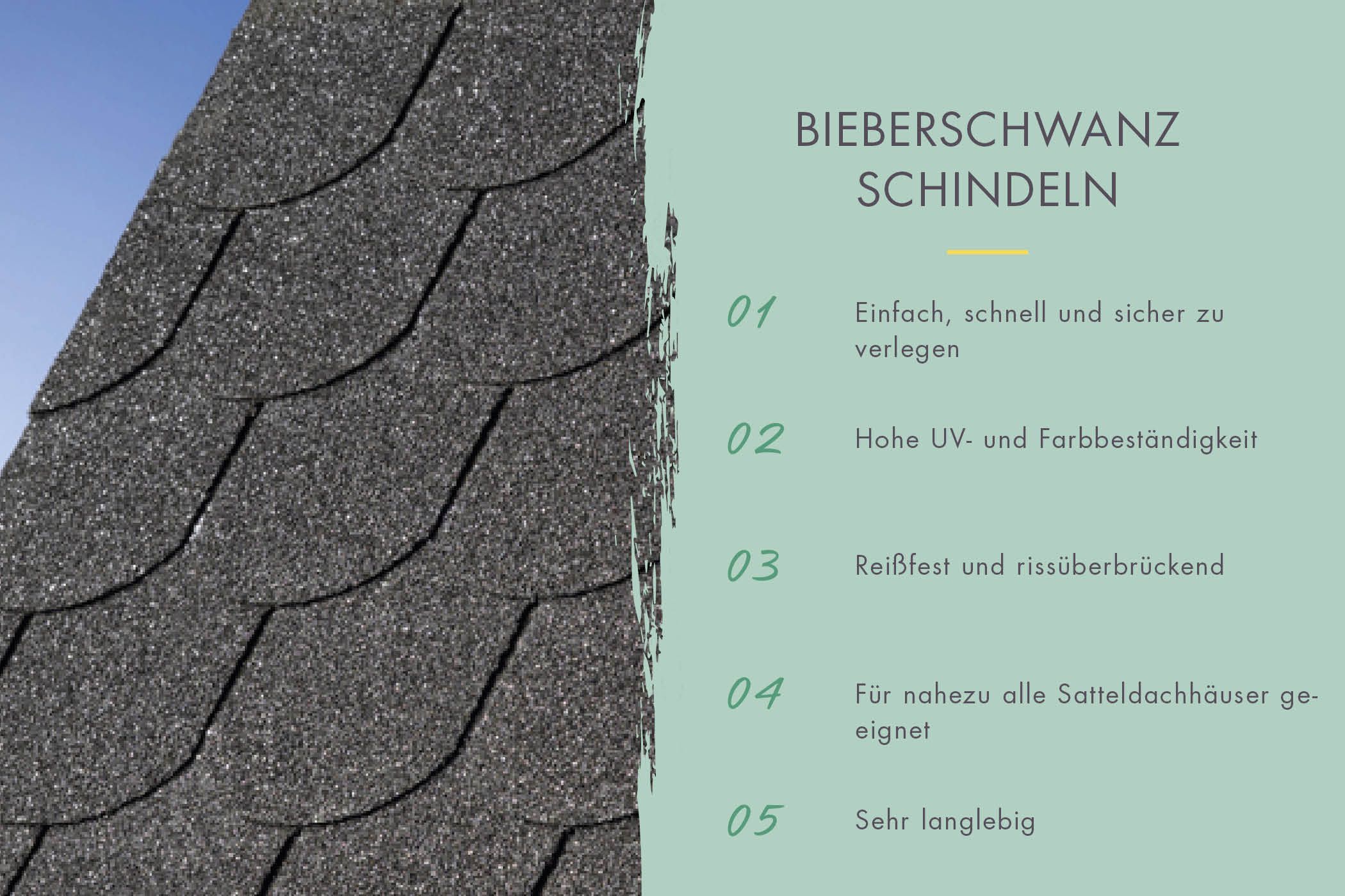 Schützen Sie Ihr Dach mit unseren Dachschindeln. Suchen Sie sich aus unseren drei Varianten die Richtigen nach Ihrem Geschmack aus. Unsere Reckteckschindeln haben eine klassische Form und sind in den Farben schwarz, dunkelgrün und dunkelrot erhältlich. Die Biberschwanz-Schindeln besitzen eine abgerundete Seite und sind ebenfalls in den Farben schwarz, dunkelgrün und dunkelrot erhältlich. Ein Paket deckt eine Dachfläche von 3m² ab. Egal ob klassisch oder abgerundet  hier ist bestimmt für jeden die richtige Schindelart dabei.