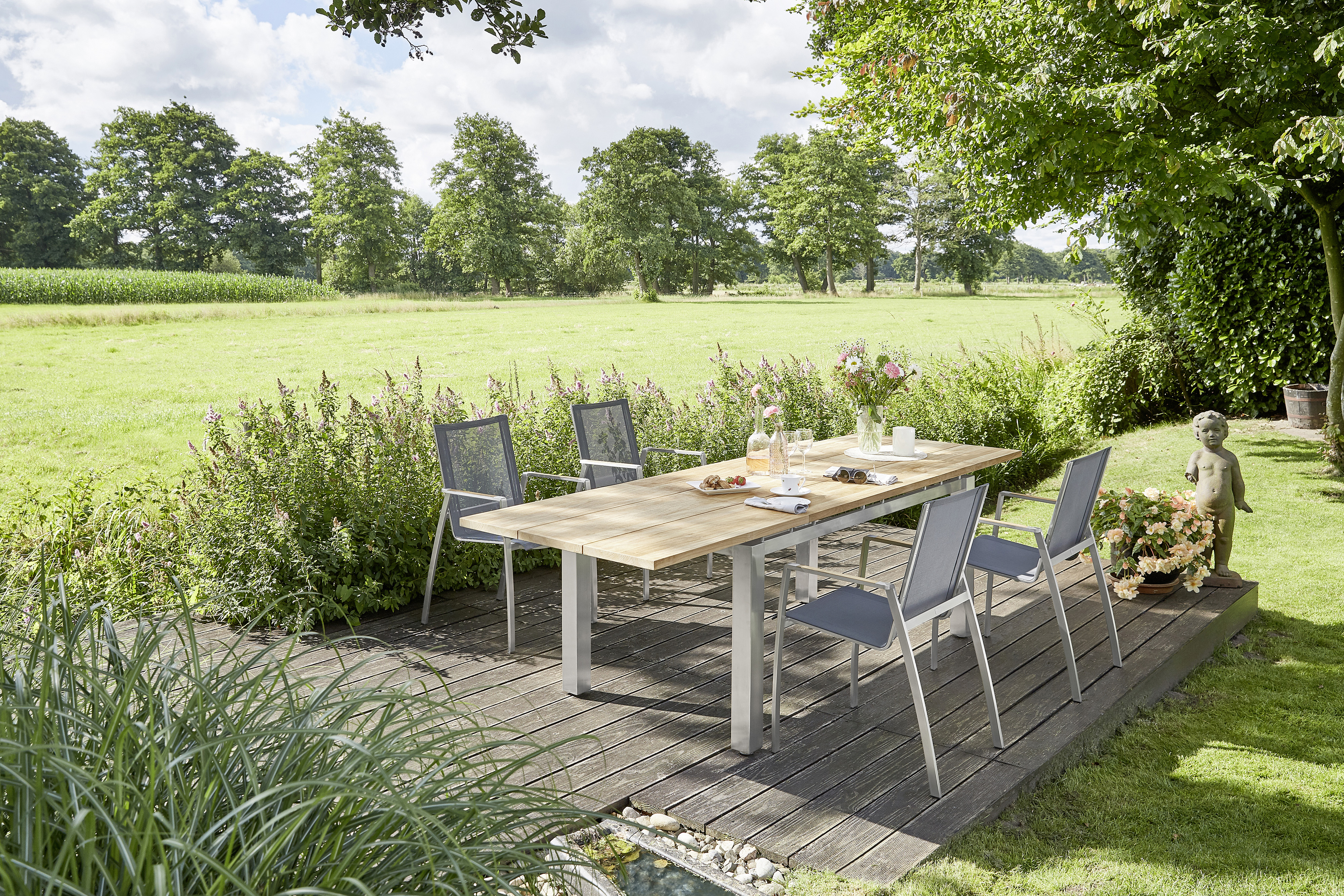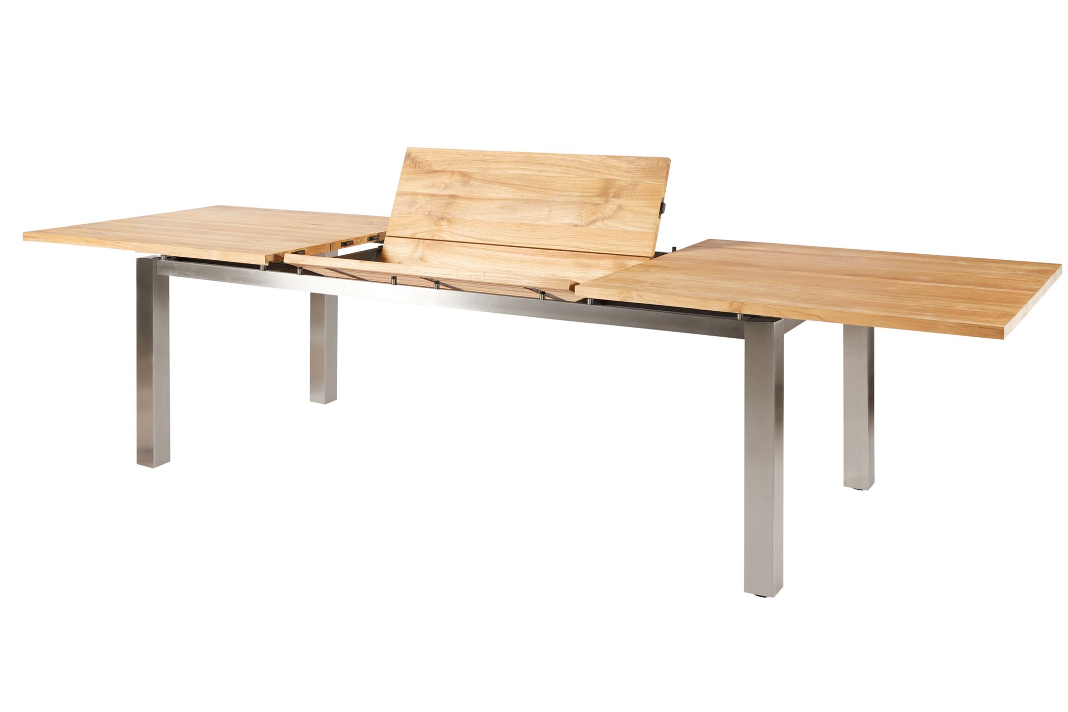 Der Levanto Ausziehtisch ist die perfekte Wahl für alle, die Flexibilität und Stil in ihrem Outdoor-Bereich suchen. Das stabile Edelstahlgestell sorgt für eine moderne, zeitlose Optik und hohe Langlebigkeit, während die Tischplatte aus drei Planken Recycled Teak-Holz dem Tisch eine natürliche und warme Ausstrahlung verleiht. Mit seinem cleveren Ausziehmechanismus lässt sich der Tisch mühelos auf bis zu 2,7 oder 3,20 m erweitern – ideal für größere Zusammenkünfte oder Familienfeiern im Freien. Die Zusatzplatte lässt sich einfach und platzsparend unter dem Tisch verstauen, indem sie zusammengeklappt wird. So bietet der Levanto Ausziehtisch sowohl Funktionalität als auch Design und passt sich jederzeit Ihren Bedürfnissen an. Die Beine sind mit Schraubfüßen für ein Niveauausgleich ausgestattet.