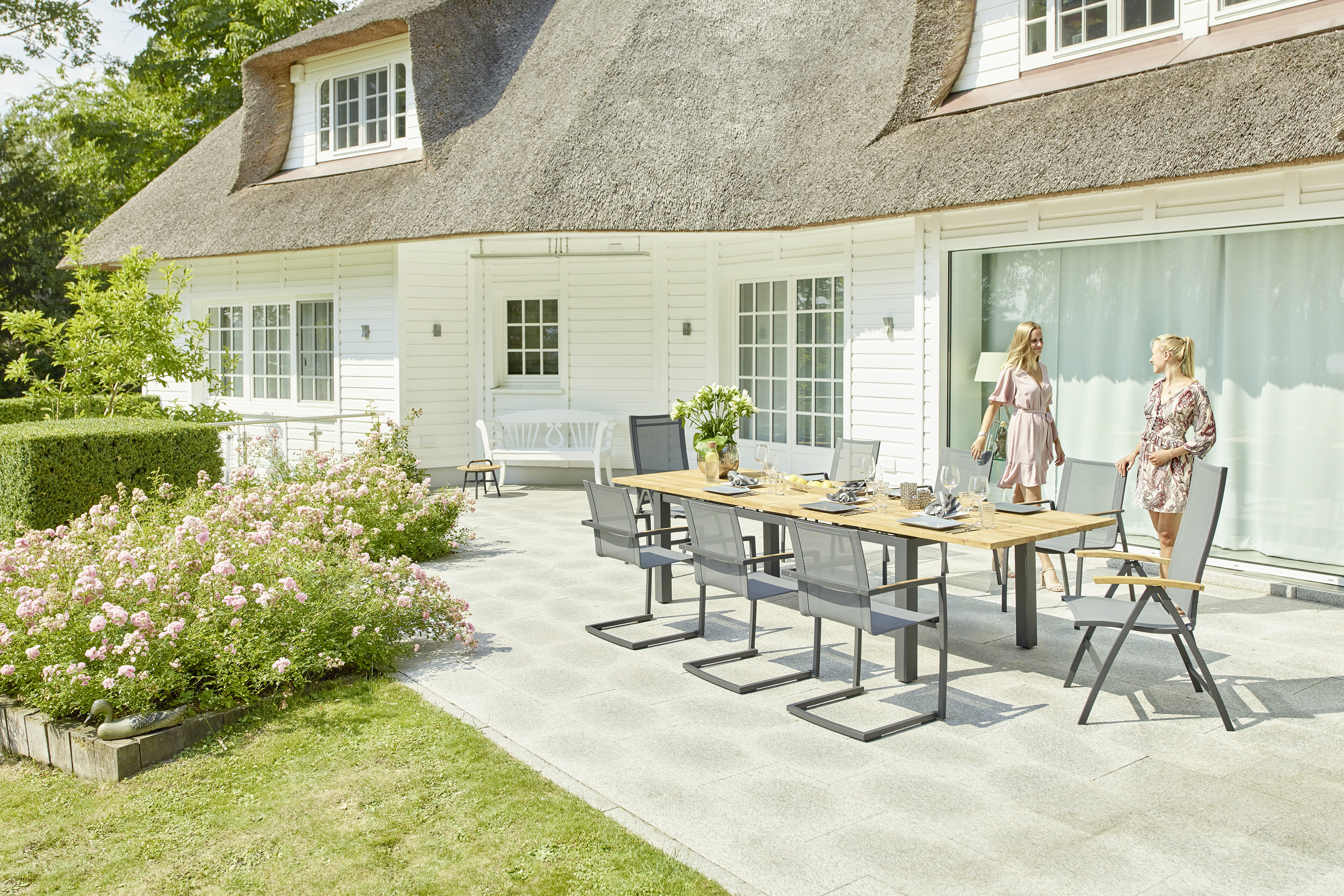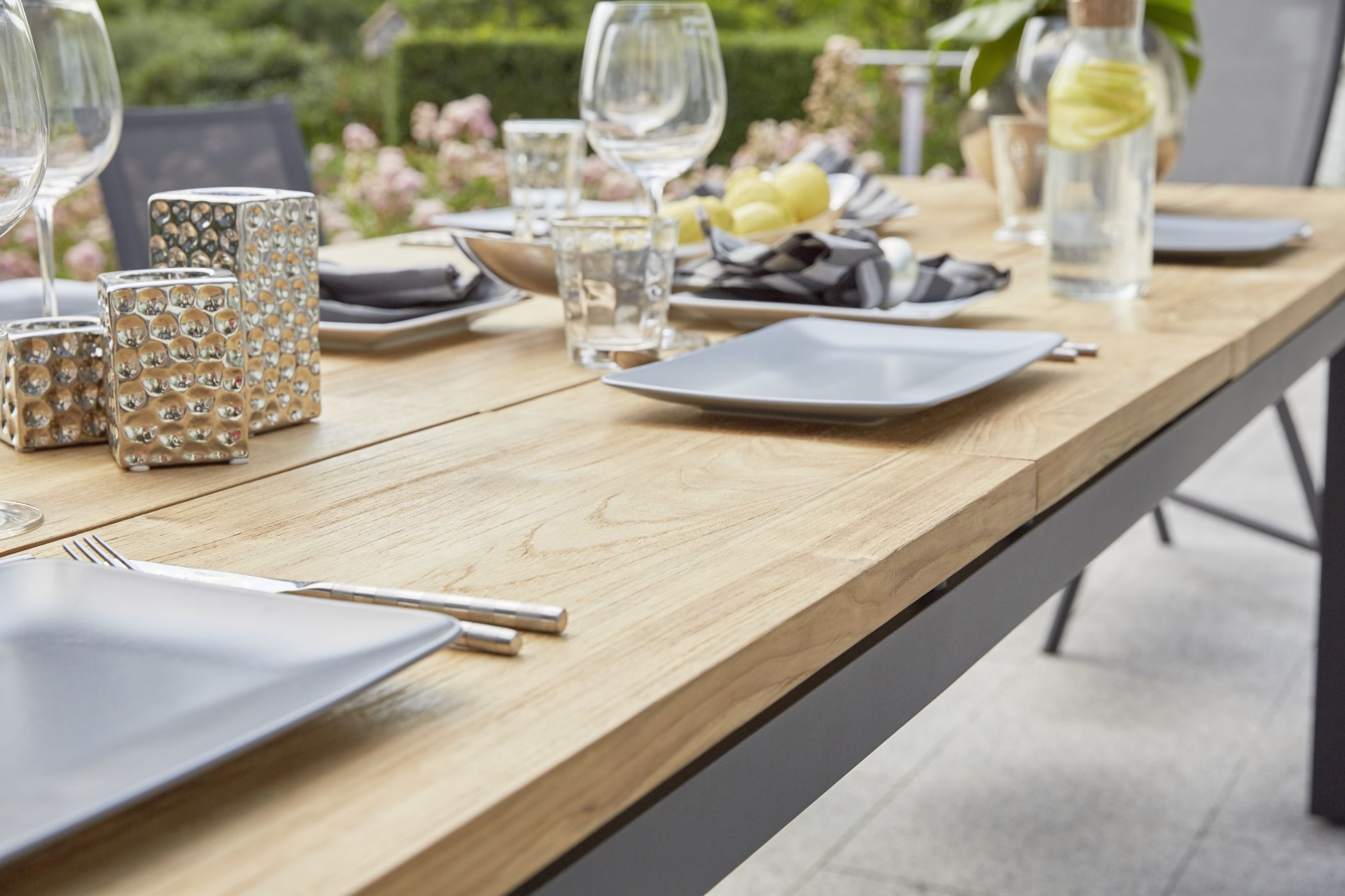 Der Porto Ausziehtisch ist die perfekte Wahl für alle, die Flexibilität und Stil in ihrem Outdoor-Bereich suchen. Das stabile Edelstahlgestell in pulverbeschichtetem dunkelgrau sorgt für eine moderne, zeitlose Optik und hohe Langlebigkeit, während die Tischplatte aus drei Planken Recycled Teak-Holz dem Tisch eine natürliche und warme Ausstrahlung verleiht. Mit seinem cleveren Ausziehmechanismus lässt sich der Tisch mühelos auf bis zu 2,70m oder 3,20 m erweitern – ideal für größere Zusammenkünfte oder Familienfeiern im Freien. Die Zusatzplatte lässt sich einfach und platzsparend unter dem Tisch verstauen, indem sie zusammengeklappt wird. So bietet der Porto Ausziehtisch sowohl Funktionalität als auch Design und passt sich jederzeit Ihren Bedürfnissen an.