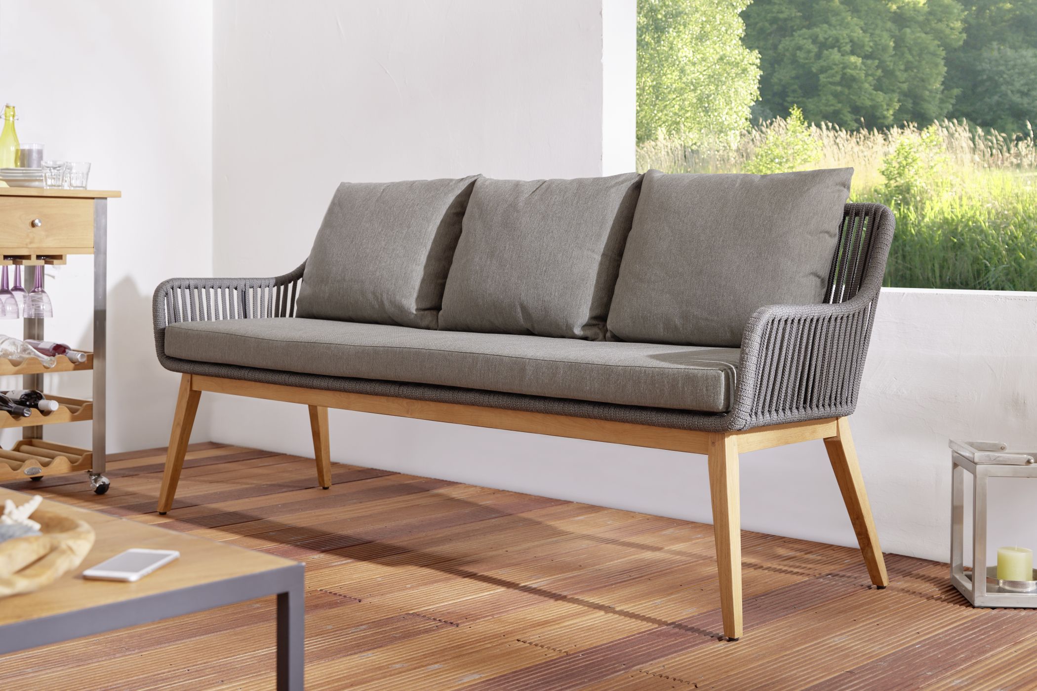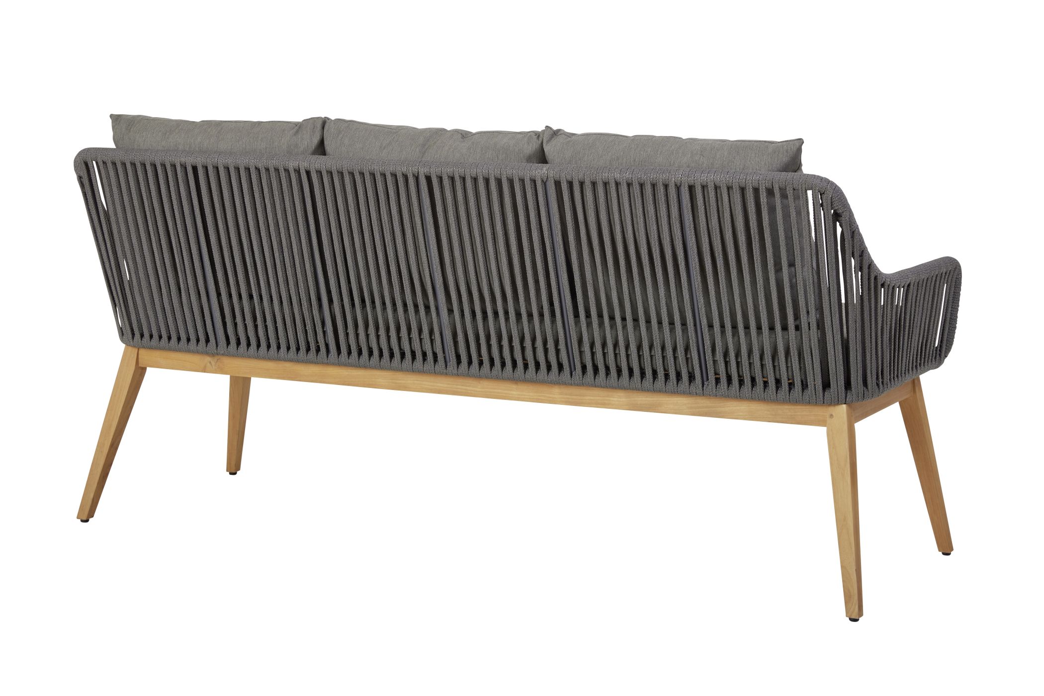 Dining Bank / Lounge mit einem Teak-Untergestell, kombiniert mit einem 14 mm breitem Ropeband in Dunkelgrau oder Hellgrau. Incl. einem durchgehenden Sitz- und drei Rückenkissen mit wasserabweisendem Olefin Stoff von Sunproof.