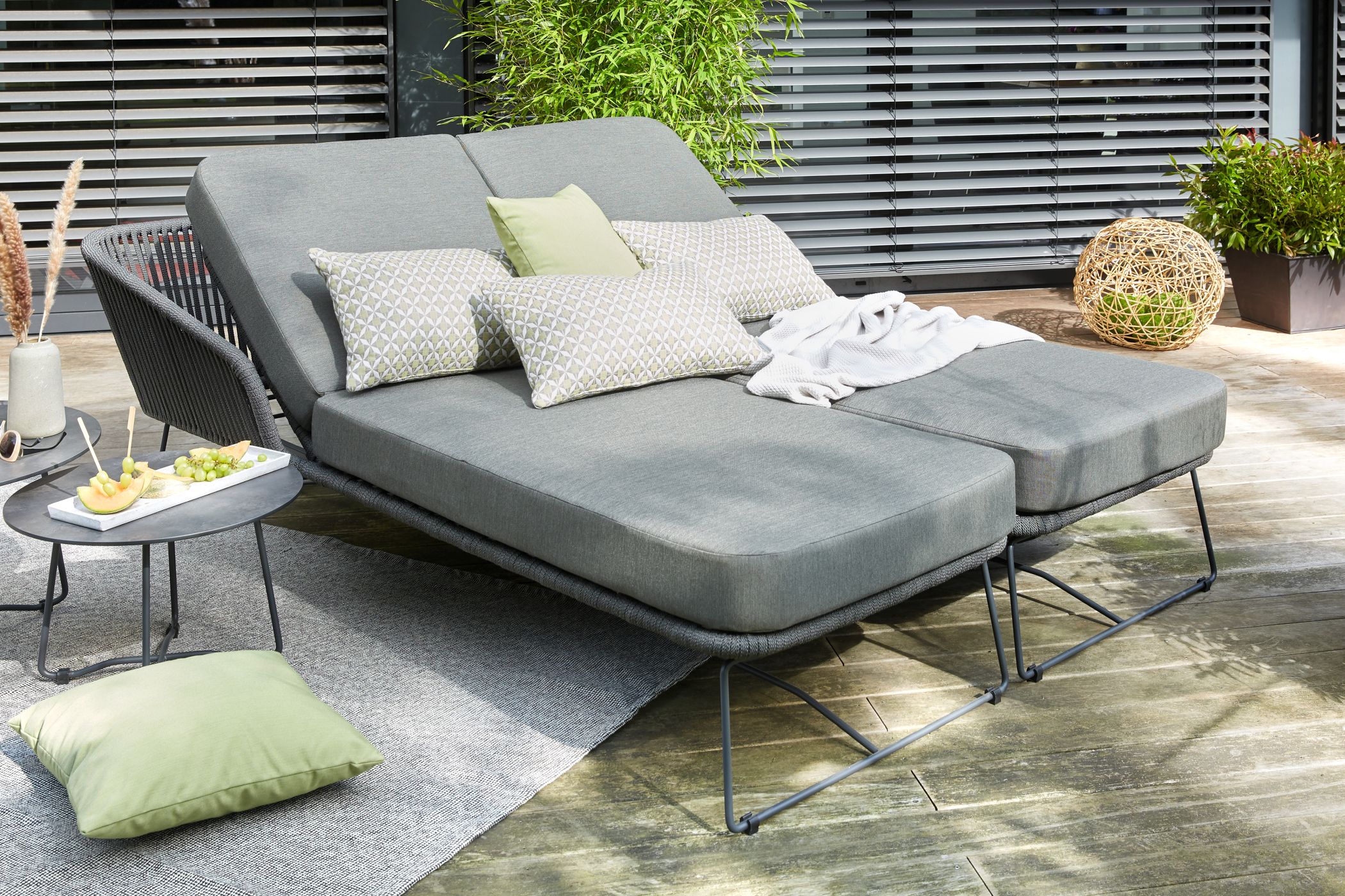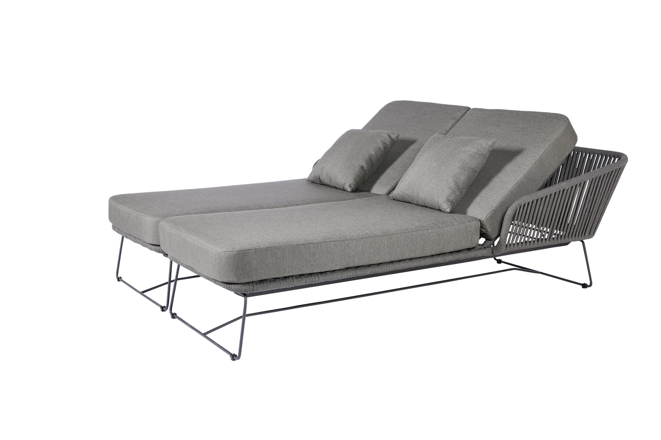 Modernes und komfortables Daybed in einer Kombination aus pulverbeschichtetem Aluminiumrahmen sowie 14 mm breitem Rope-Band in Dunkelgrau oder Hellgrau und einem Kufengestell aus Edelstahl Dunkelgrau, pulverbeschichtet . Die Rückenlehne ist 3-fach verstellbar. Inklusive Sitz- und Rückenkissen mit wasserabweisendem Olefin Stoff von Sunproof. Kombinierbar mit Milos Modullounge !