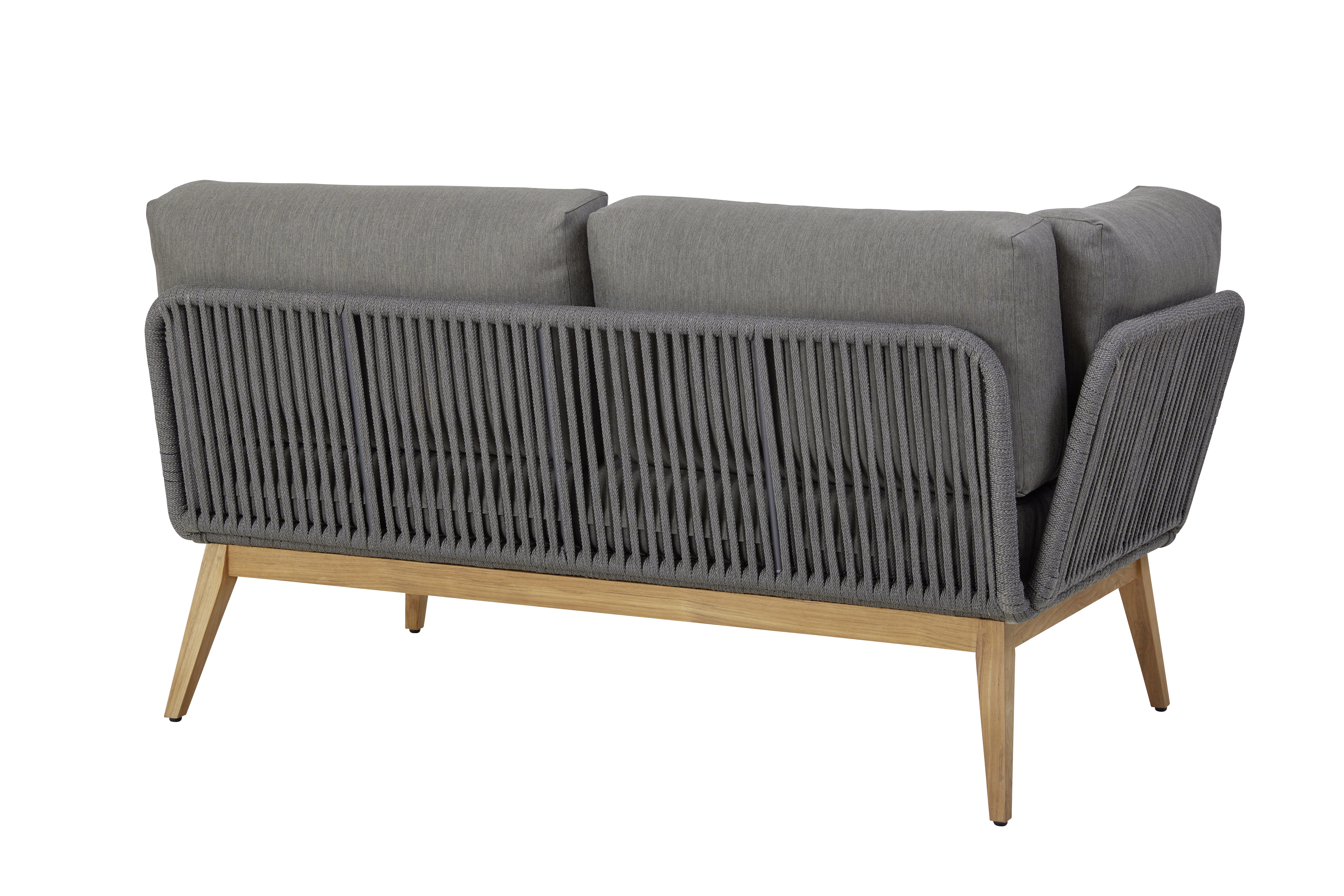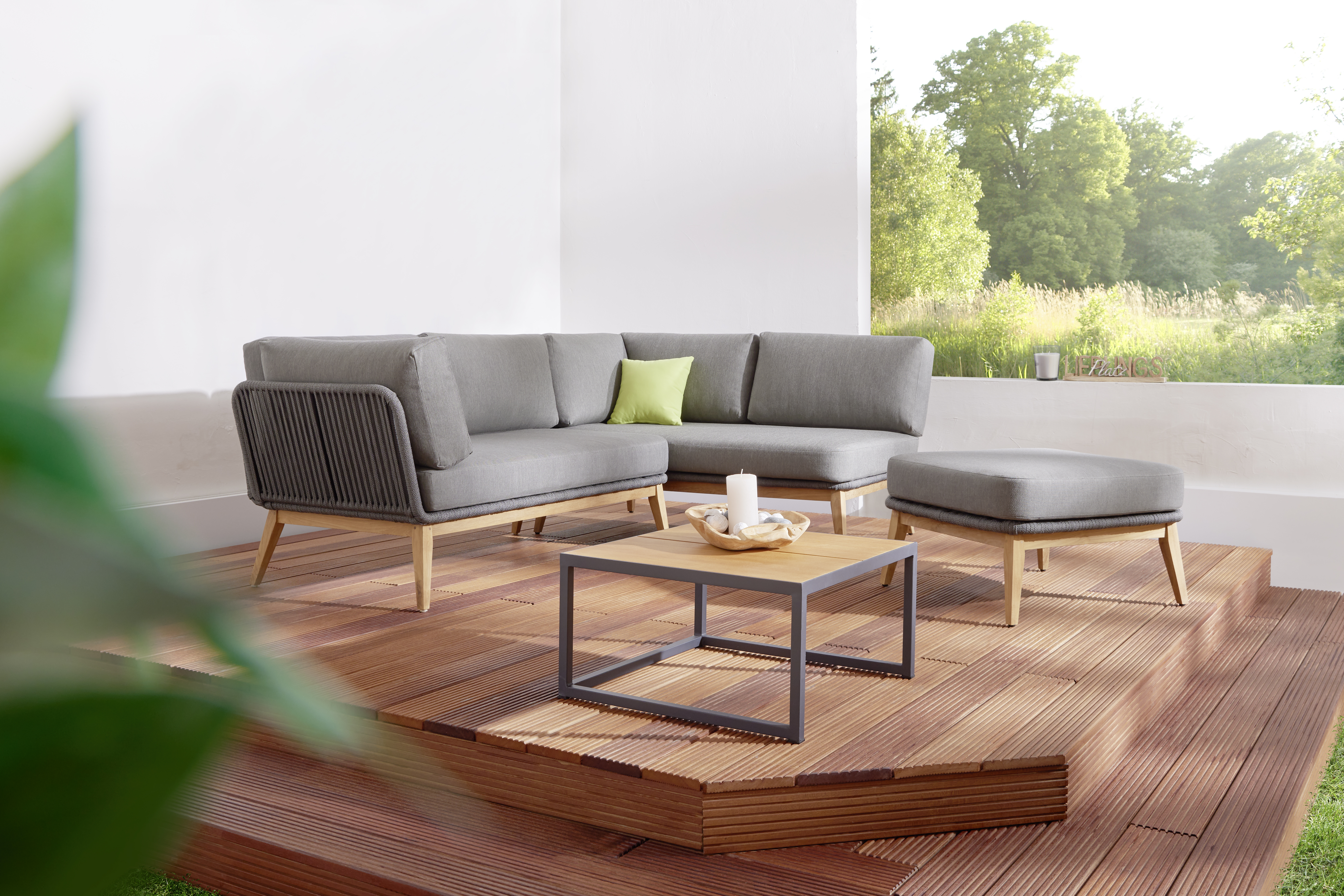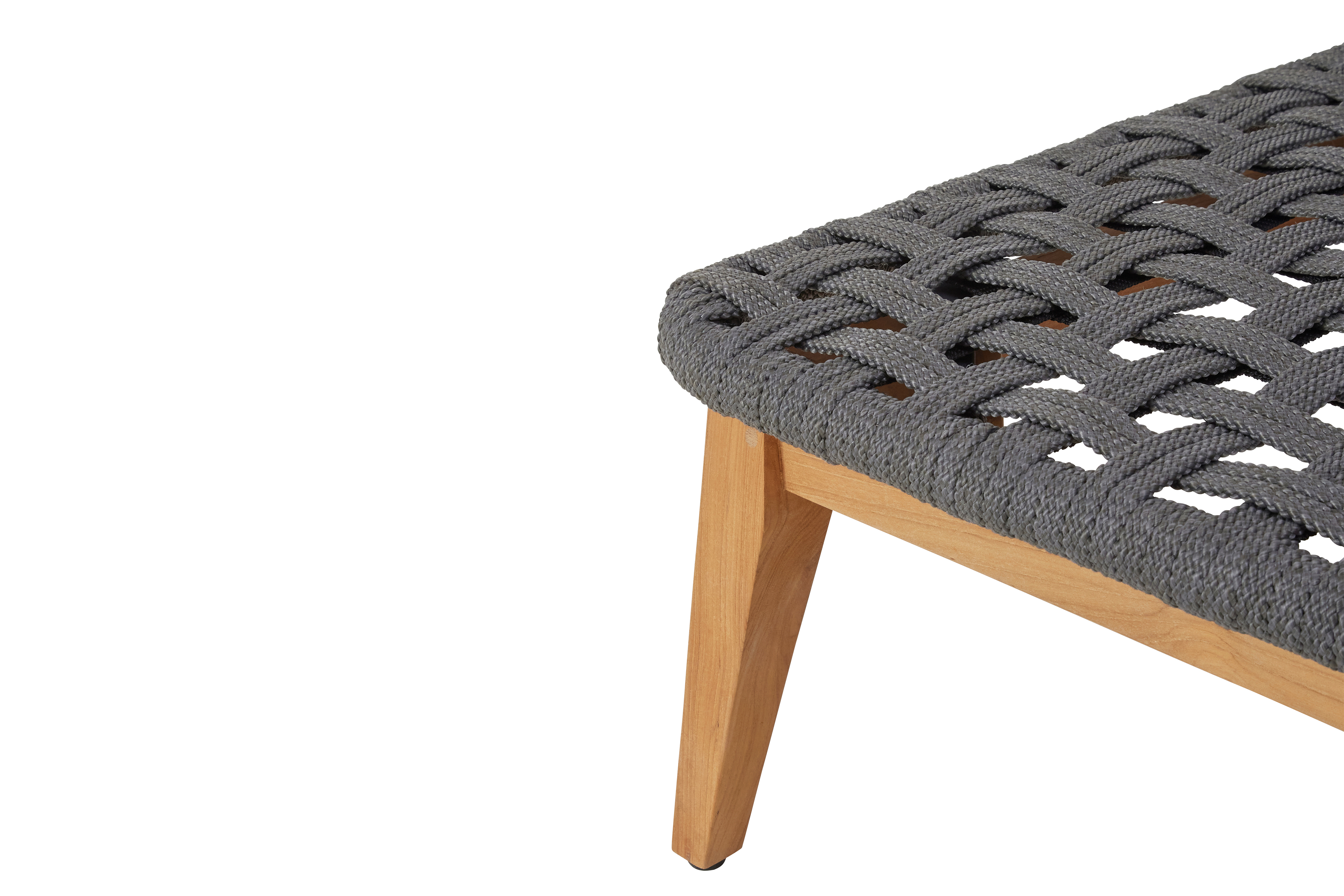 Moderne und komfortable Modullounge in einer Kombination aus pulverbeschichtetem Aluminiumrahmen sowie 14 mm breitem Rope-Band in Dunkelgrau oder Hellgrau und einem Teak-Untergestell. Inklusive Sitz- und Rückenkissen mit wasserabweisendem Olefin Stoff von Sunproof.