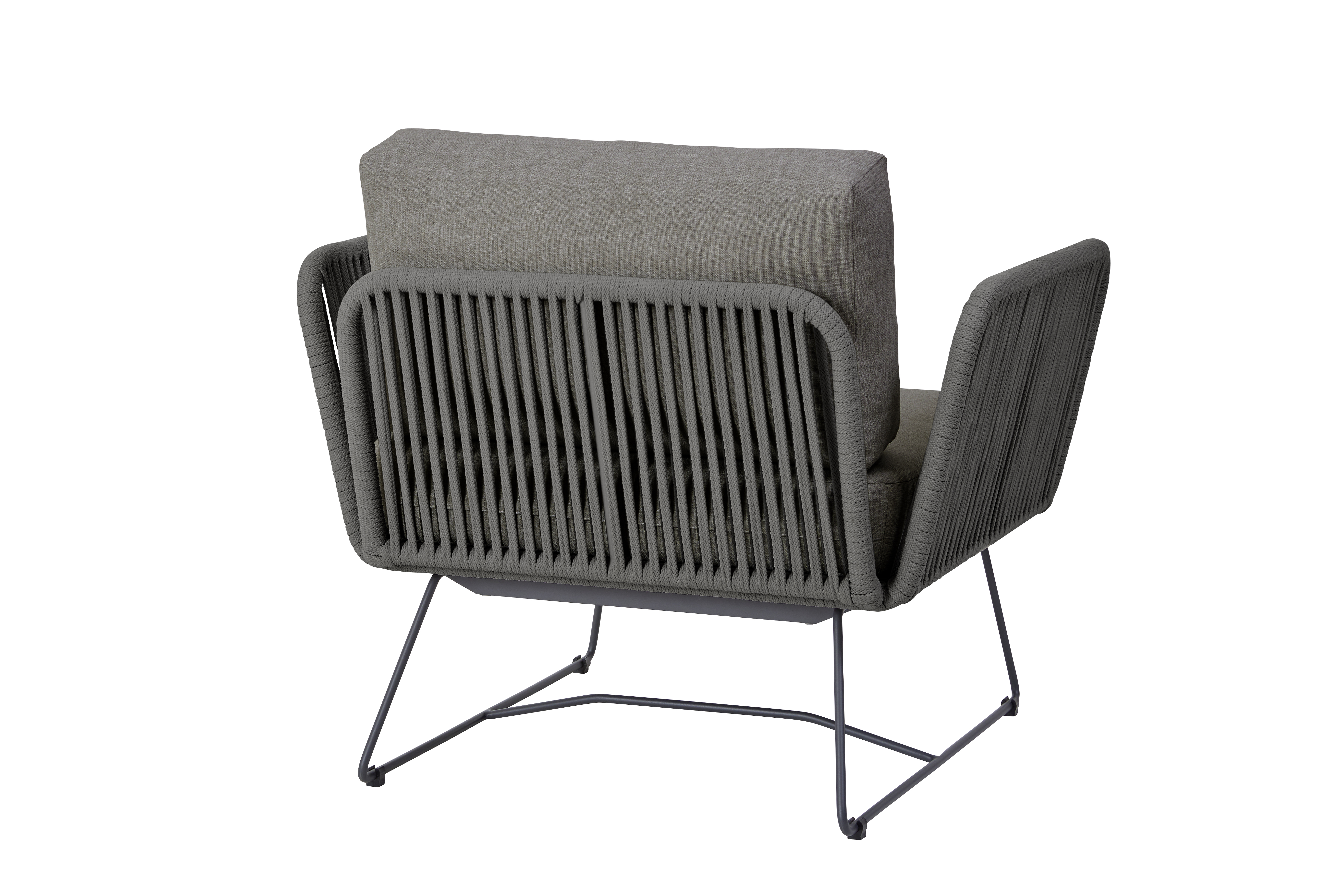 Moderne und komfortable Modullounge in einer Kombination aus pulverbeschichtetem Aluminiumrahmen sowie 14 mm breitem Rope-Band in Dunkelgrau oder Hellgrau und einem Kufengestell aus Edelstahl Dunkelgrau, pulverbeschichtet . Inklusive Sitz- und Rückenkissen mit wasserabweisendem Olefin Stoff von Sunproof.