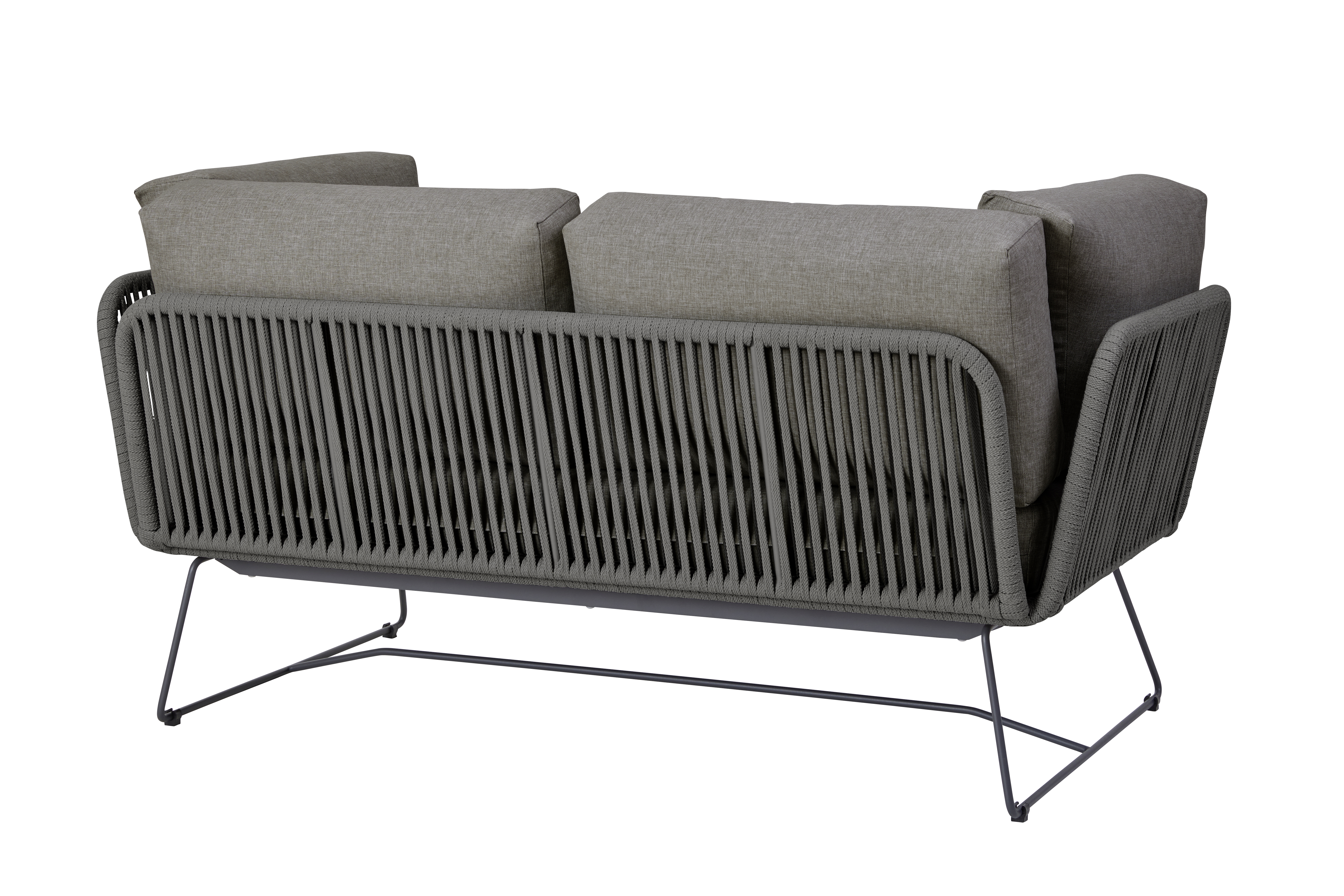 Moderne und komfortable Modullounge in einer Kombination aus pulverbeschichtetem Aluminiumrahmen sowie 14 mm breitem Rope-Band in Dunkelgrau oder Hellgrau und einem Kufengestell aus Edelstahl Dunkelgrau, pulverbeschichtet . Inklusive Sitz- und Rückenkissen mit wasserabweisendem Olefin Stoff von Sunproof.