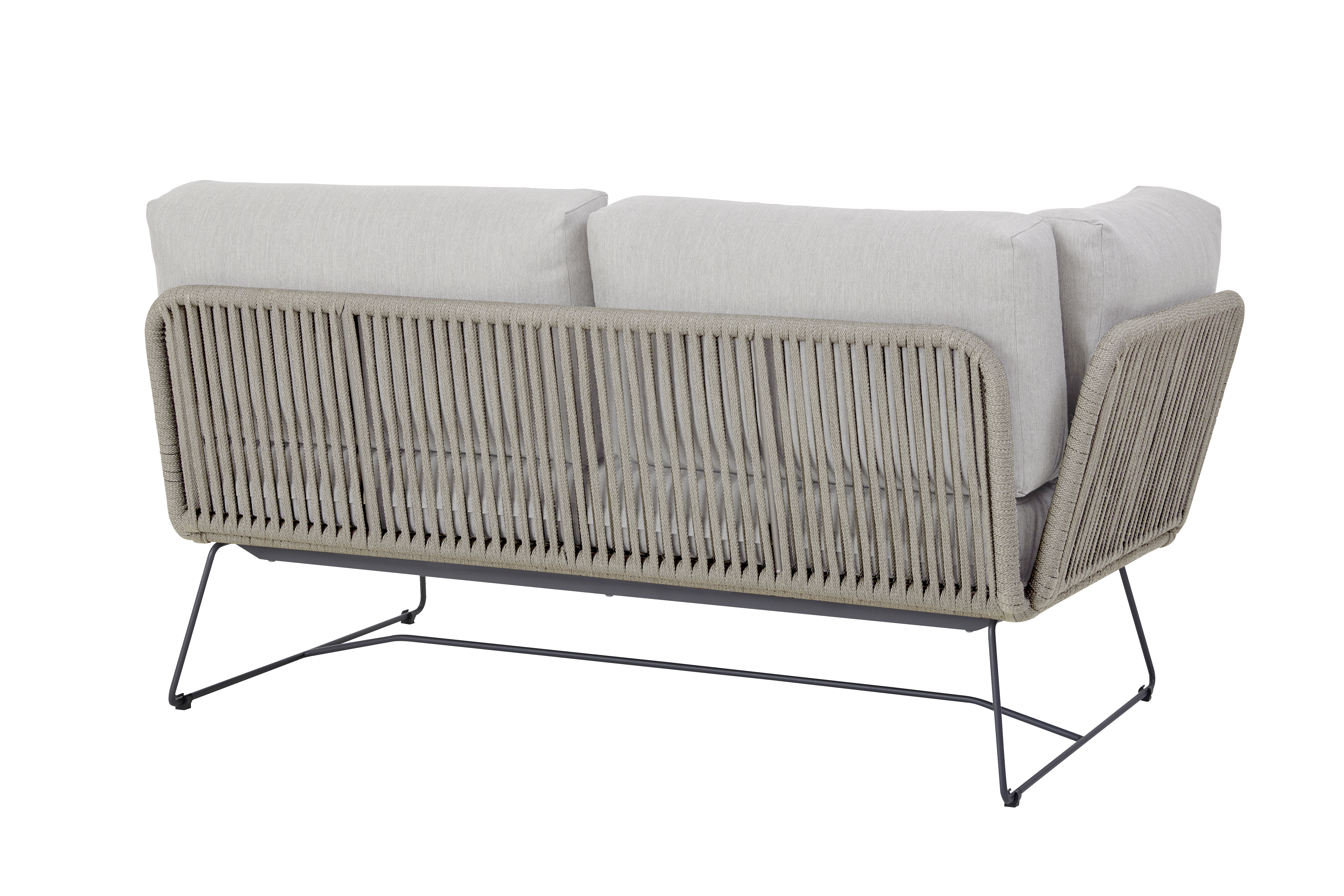 Moderne und komfortable Modullounge in einer Kombination aus pulverbeschichtetem Aluminiumrahmen sowie 14 mm breitem Rope-Band in Dunkelgrau oder Hellgrau und einem Kufengestell aus Edelstahl Dunkelgrau, pulverbeschichtet . Inklusive Sitz- und Rückenkissen mit wasserabweisendem Olefin Stoff von Sunproof.