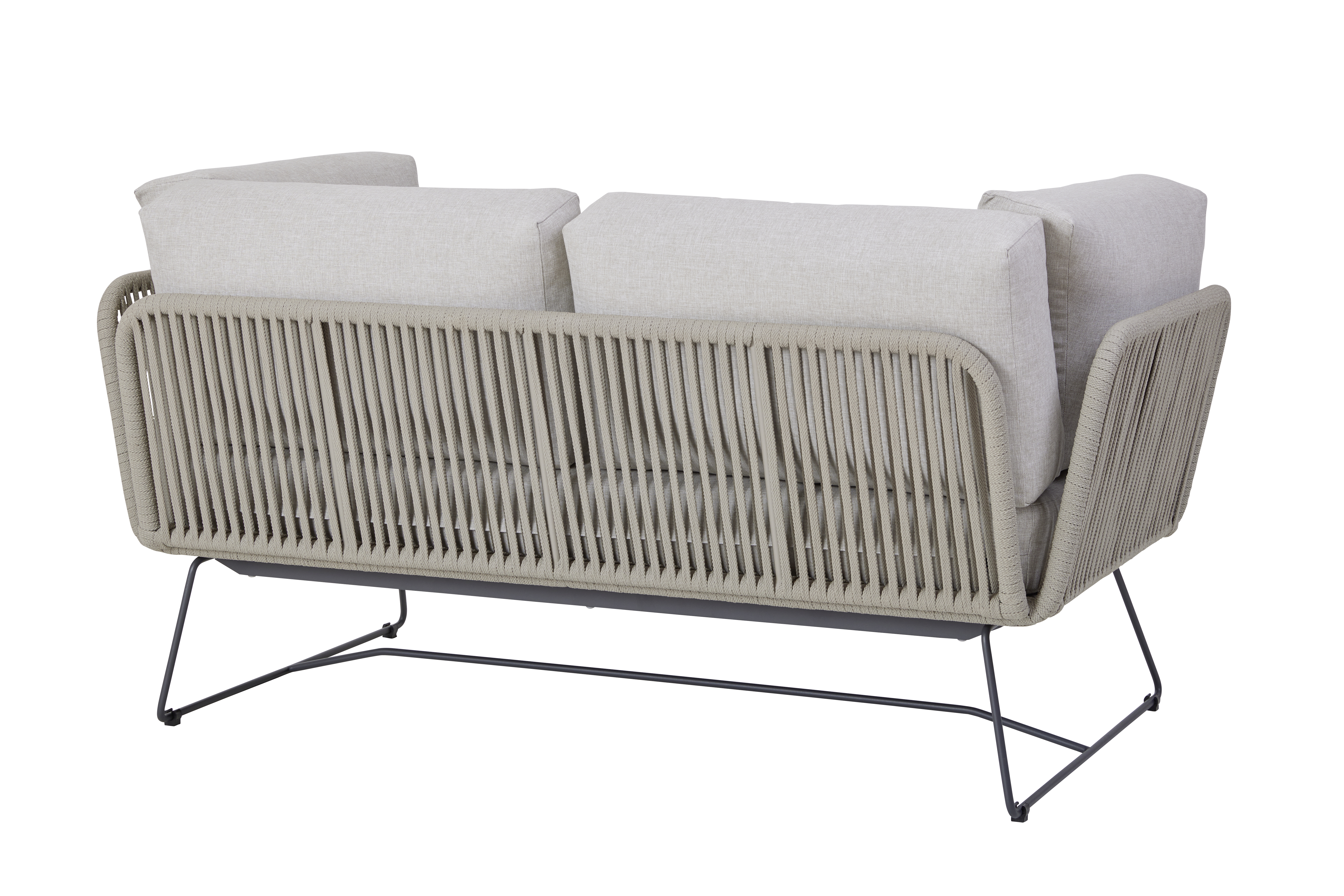 Moderne und komfortable Modullounge in einer Kombination aus pulverbeschichtetem Aluminiumrahmen sowie 14 mm breitem Rope-Band in Dunkelgrau oder Hellgrau und einem Kufengestell aus Edelstahl Dunkelgrau, pulverbeschichtet . Inklusive Sitz- und Rückenkissen mit wasserabweisendem Olefin Stoff von Sunproof.