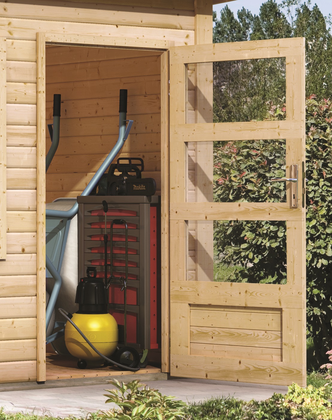 Passen Sie Ihr Gartenhaus Ihren Gegebenheiten an. Die Einflügeltür für Gartenhäuser für eine Wandstärke von 28 mm oder 38mm hat ein Außenmaß von (BxH) 98 x 182 cm. Das Lochmaß mit Zarge beträgt ca. 182 x 91 cm. Die Tür wird inklusive eines Türrahmens, Holz-Türschwelle, Zylinderschloss mit 3 Schlüsseln, Beschläge und Umrüstleistenset für Wandstärke 28mm auf 38 mm etc. geliefert. Verschlossen werden kann die Einflügeltür mithilfe eines Zylinderschloss inklusive drei Schlüsseln. So können Sie Ihr Gartenhaus als Durchgang nutzen und es von zwei Seiten begehbar machen. Oder Sie benötigen für Ihr eigenes DIY Projekt eine Extra Tür, wir haben das richtige Produkt für Sie. Die Tür besitzt drei Lichtausschnitte aus Kunstglas und ist in naturbelassen erhältlich.