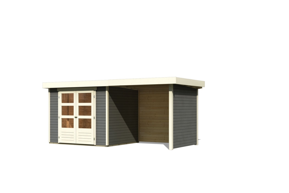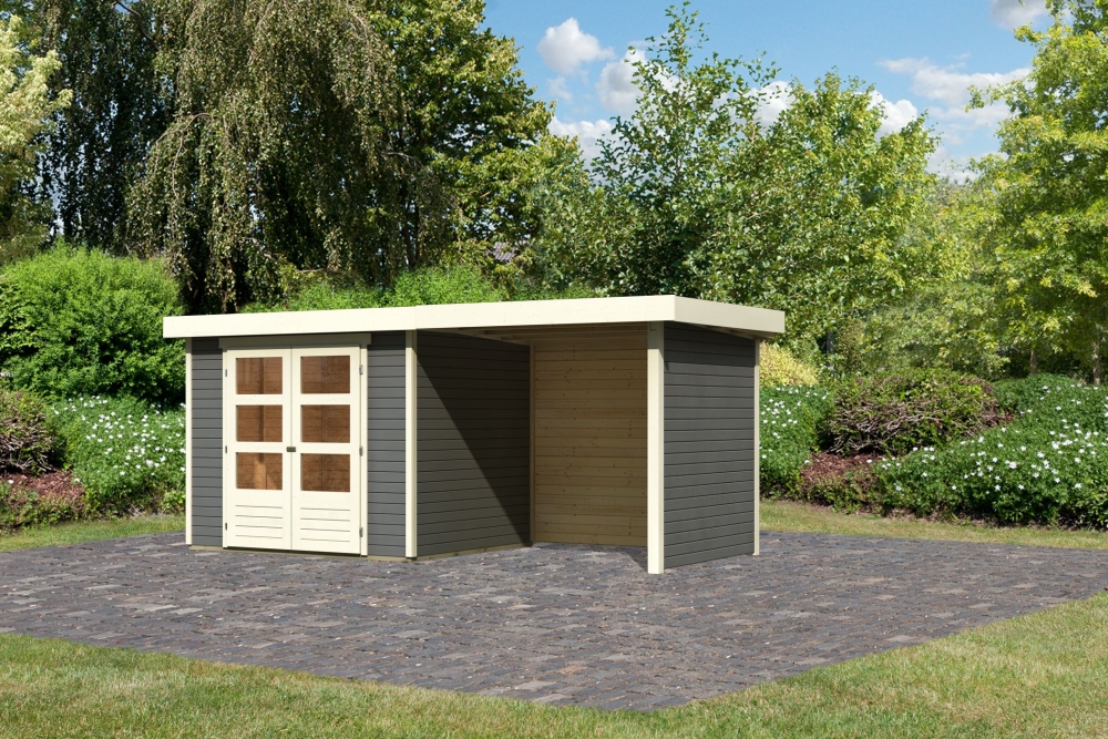 Gartenhaus Askola 3 - der Akzent in Ihrem Garten. Das 19mm Systemhaus aus nordischer Fichte im einfachen Steck- und Schraubsystem ist in der Farbe Terragrau, Anthrazit und in Naturbelassen erhältlich.