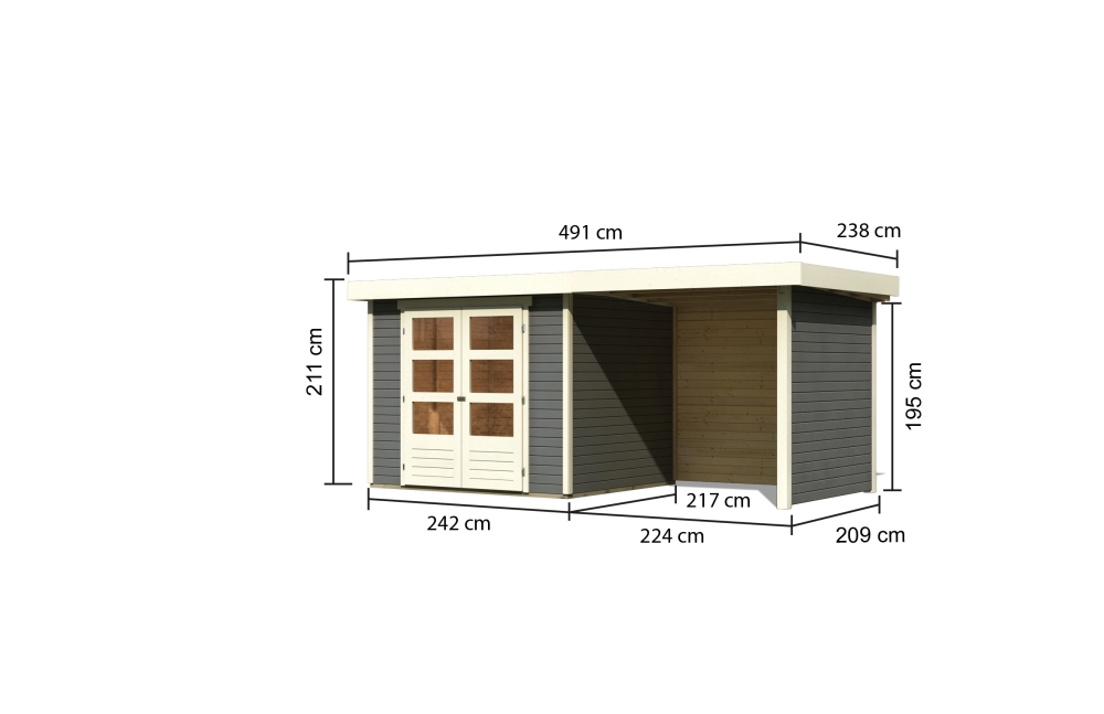 Das Haus ist ebenfalls mit einem Anbaudach in den Breiten 1,50 m, 2,40 m oder 2,80 m erhältlich. Dieses dient optimal als Unterstand für Gartengeräte oder für eine bequeme Sitzgruppe für Grillabende. Geschütztes Grillen an einem verregneten Sommertag steht nun nichts mehr im Wege.