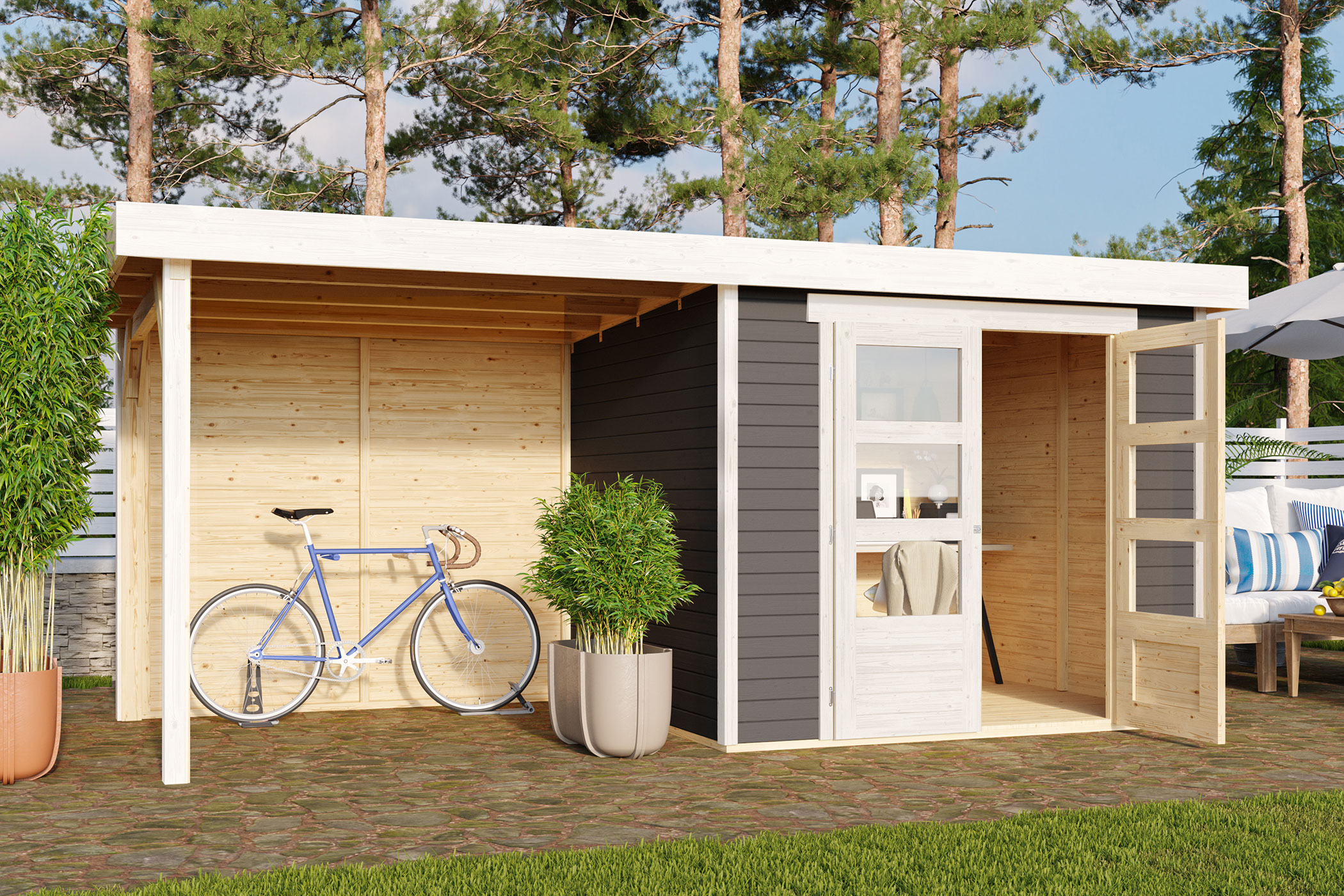 Das Haus ist ebenfalls mit einem Anbaudach in den Breiten 2,40 m oder 2,80 m erhältlich. Dieses dient optimal als Unterstand für Gartengeräte oder für eine bequeme Sitzgruppe für Grillabende. Geschütztes Grillen an einem verregneten Sommertag steht nun nichts mehr im Wege.