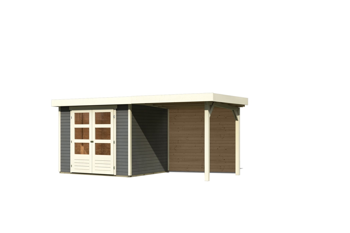 Gartenhaus Askola 3 - der Akzent in Ihrem Garten. Das 19mm Systemhaus aus nordischer Fichte im einfachen Steck- und Schraubsystem ist in der Farbe Terragrau und in Naturbelassen erhältlich.
