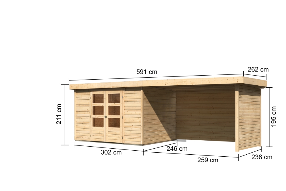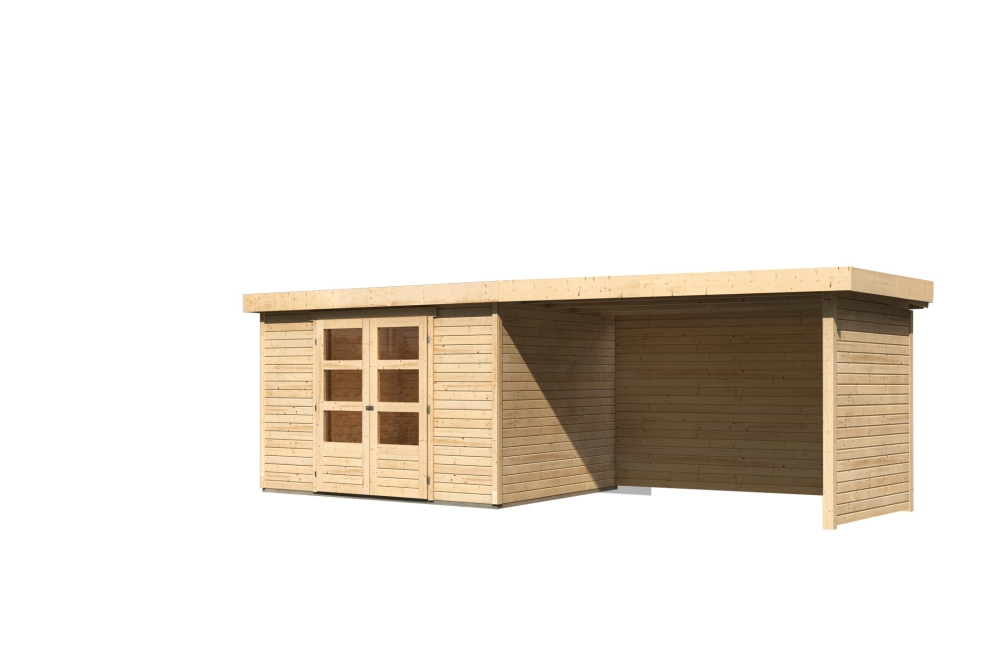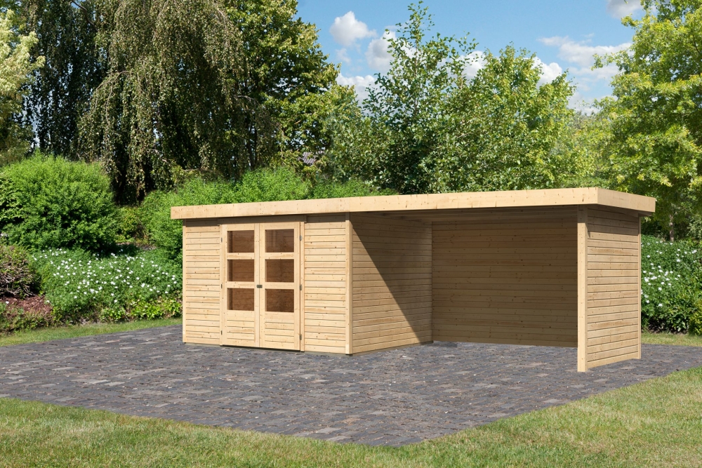 Karibu großes Gerätehaus “Askola 5” Flachdach mit Anbau/Terrasse modern aus Holz in Natur