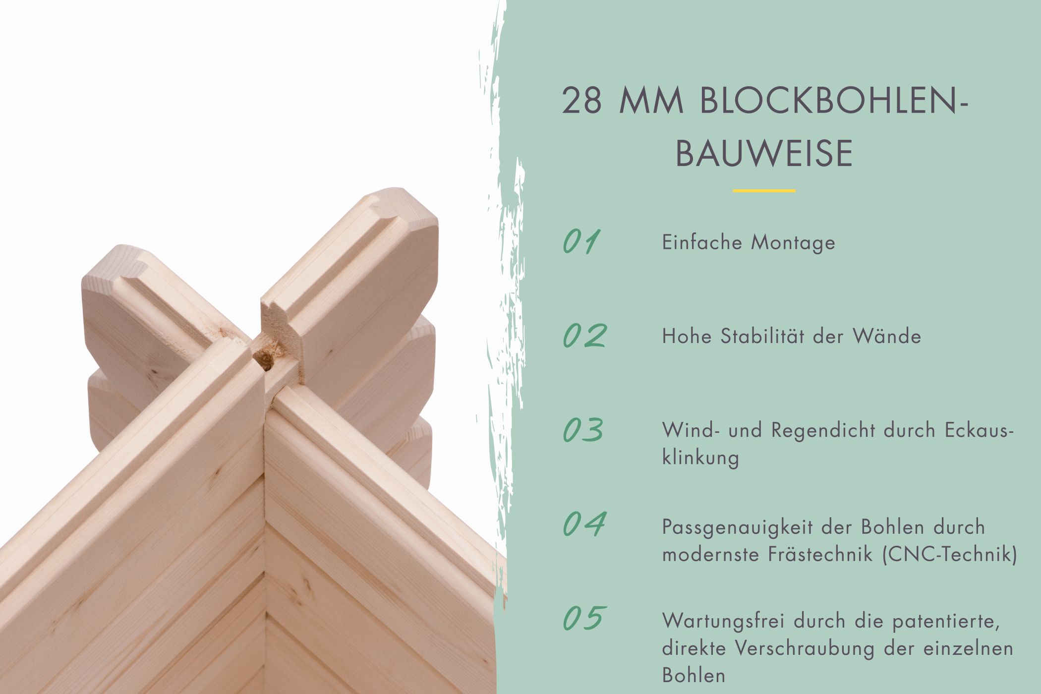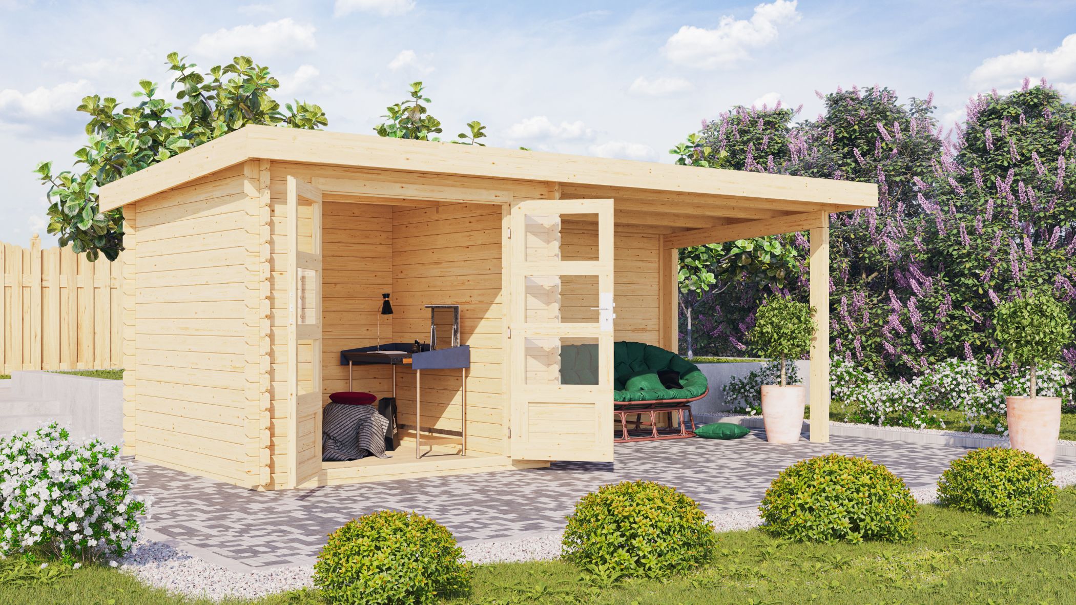 Das moderne Blockbohlenhaus mit Pultdach. Das Bastrup 2 mit 28 mm starken Bohlen besteht aus nordischem Fichtenholz. Ein großer Vorteil dieser Serie ist die patentierte 6-Plus-Eckverbindung. Zusammen sorgt dies nicht nur für eine langlebige, stabile Konstruktion, sondern auch für ein robustes Gesamtbild. Das macht das Gartenhaus Bastrup mit einem Außenmaß von (BxT) 237 x 237 cm zu einem langen, treuen und festen Begleiter im eigenen Garten. Einmal aufgebaut und eingerichtet ist das Haus nicht mehr wegzudenken. In das Innere gelangen Sie durch eine großzügige Doppelflügeltür mit drei Lichtausschnitten je Türflügel. Gesichert wird das Haus mithilfe eines Zylinderschlosses in der Tür. Durch die Lichtausschnitte gelangt Tageslicht in den Innenbereich und lässt das Haus somit nicht nur von außen strahlen. Das Gartenhaus ist in Naturbelassen erhältlich und kann durch ein optional erhältliches Anbaudach in der Breite 2 m oder 3 m im Außenbereich erweitert werden. Dies lässt viel Platz für Ihre Gestaltungsideen. Verstauen Sie zum Beispiel Ihre Gartengeräte im Inneren des Häuschens, um Ihren Garten nach getaner Arbeit ordentlich zu hinterlassen oder nutzen Sie den Innenbereich zur Lagerung Ihrer Gartenmöbel im Winter. Der zusätzliche Platz unter dem Anbaudach kann im Sommer als Schutz vor der Witterung für eine gemütliche Sitzgruppe dienen. Bereichern Sie Ihren Garten mit dem modernen Blockbohlenhaus Bastrup 2.