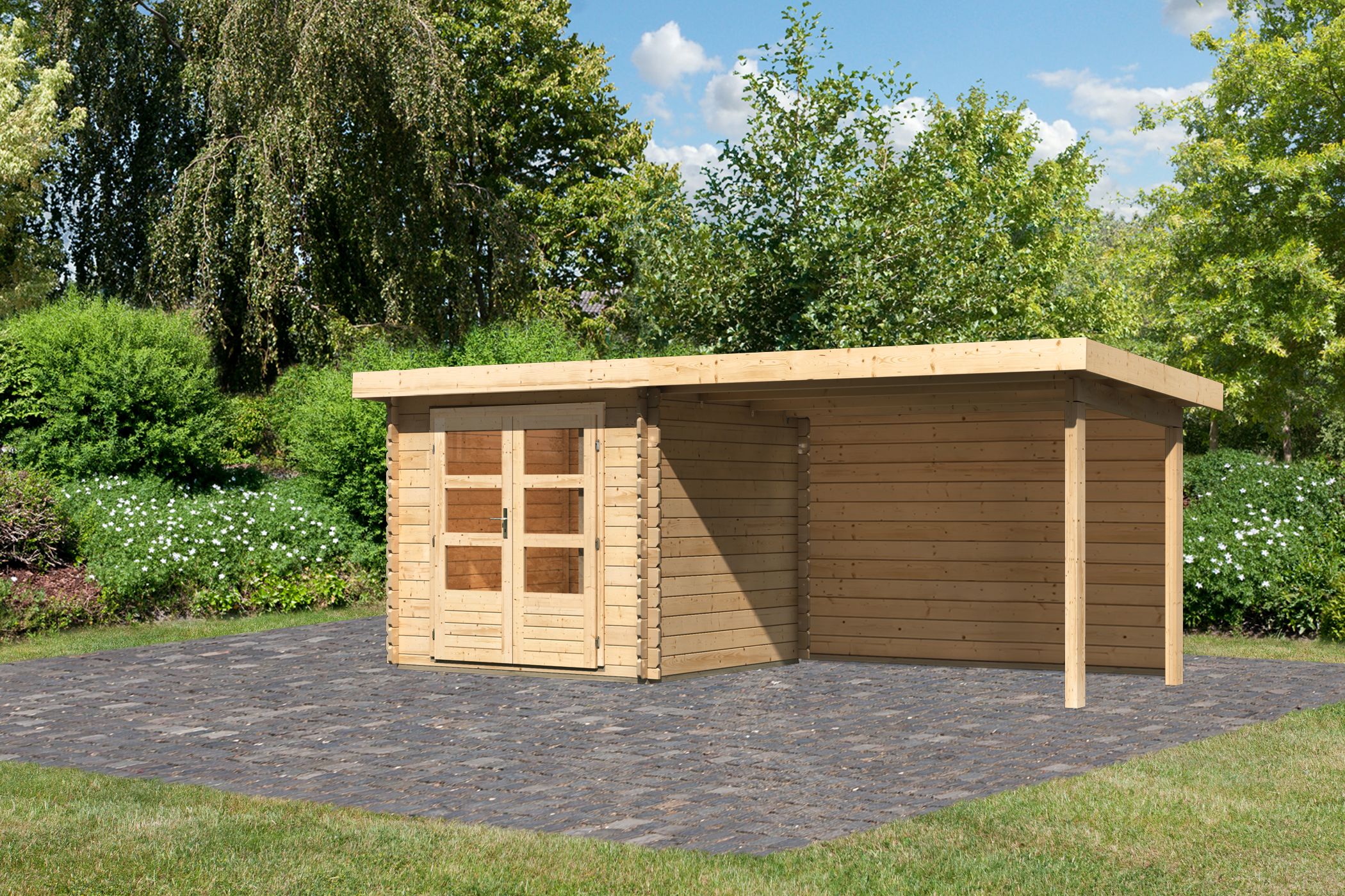 Karibu Gerätehaus “Bastrup 2” Pultdach mit Anbau/Terrasse aus Holz in Natur