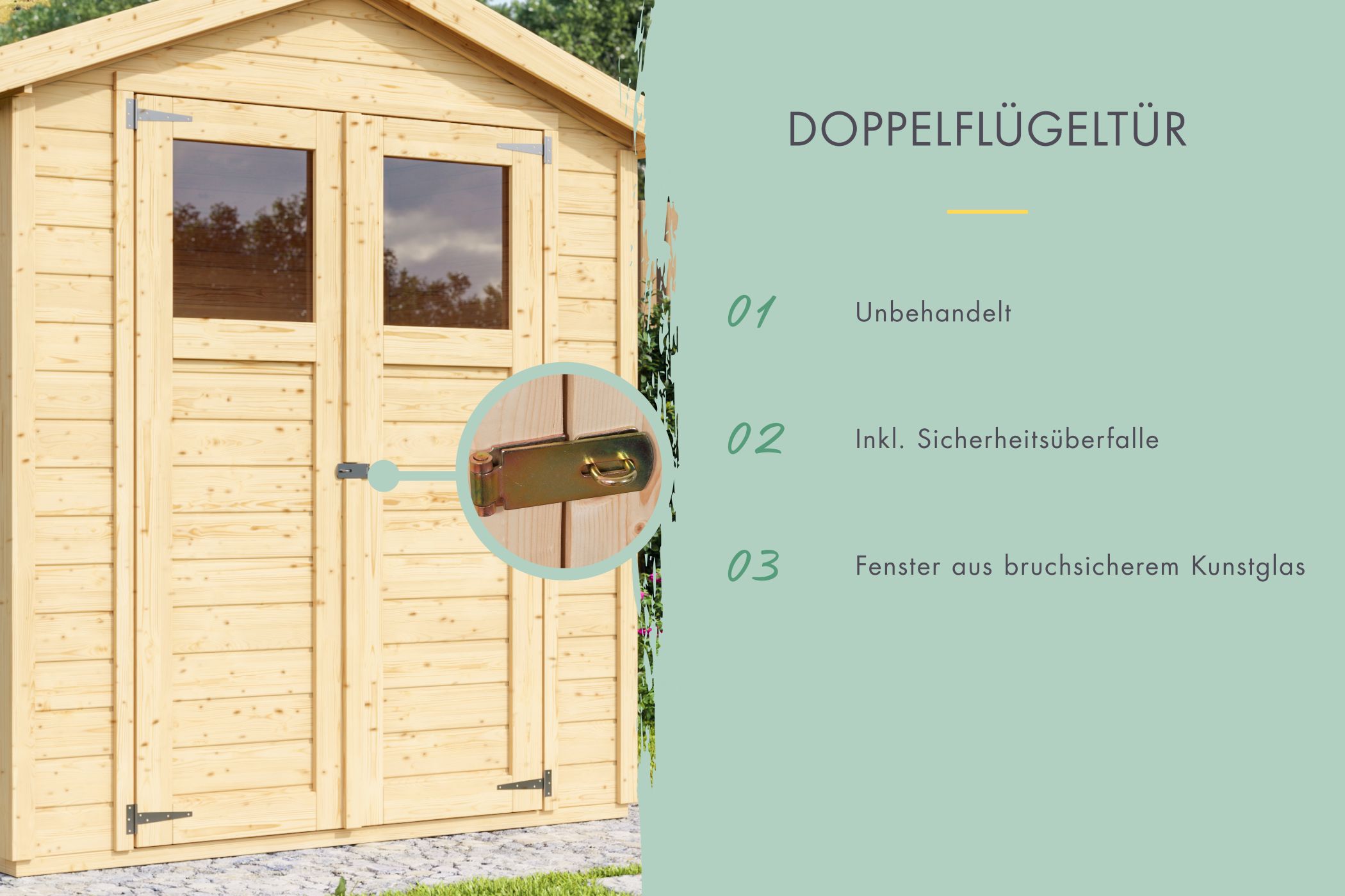 Das Satteldach mit einer Dachfläche von 5,8 m² schützt Ihre Gegenstände von oben. Durch das Verlegen von unseren optional erhältlichen Dachfolie oder einen Fußboden können Sie die Optik des Gartenhauses abrunden. Durch eine Doppelflügeltür mit einem Lichtausschnitt pro Türflügel und einem feststehenden Fenster kommt viel Tageslicht ins Innere und sorgt so für Helligkeit im Raum. Dies bietet Ihnen eine natürliche Lichtquelle zum Arbeiten. Ergänzen Sie das Ambiente Ihres Gartens mit dem Gartenhaus Dalin 1.