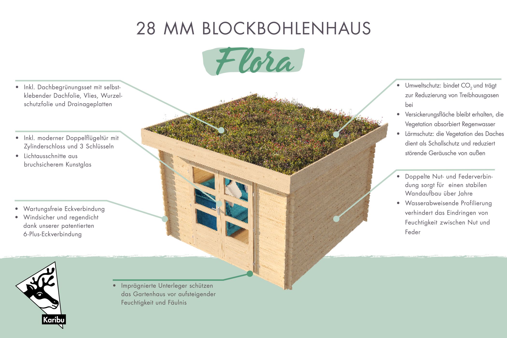 Unser Blockbohlenhaus Flora verfügt über eine besonders hohe Dachlast von 300 kg/m² und das nötige Paket zur Dachbegrünung. Mit der Dachbegrünung hat das Gartenhaus Flora immer noch eine Schneelast von 125 kg/m². Das Haus wird aus 28 mm starken Wandbohlen aus nordischer Fichte in klassischer Bockbohlenbauweise gefertigt und gewährleistet somit einen einfachen Aufbau und eine sehr stabile Konstruktion. Bei dieser Bauweise werden die Wandbohlen reihum aufgestapelt, beginnend mit einer halben Bohle für eine glatte und stabile Auflage, und dann miteinander verschraubt. Unsere patentierte 6-Plus-Eckverbindung garantiert eine sehr hohe Regen- und Winddichte. Die in den Eckverbindungen sitzenden Vorbohrungen für die Verschraubung der Blockbohlen sind werkseitig vorgefertigt und verkürzen die Dauer der Montage enorm. Das Pultdach besteht aus Massivholz. Der vordere Dachüberstand von 280 mm schützt den Eingangsbereich darüber hinaus wirkungsvoll. Die Grundfläche beträgt 7,84 qm bei einem umbauten Raum von 16,5 cbm. Mit einer Seitenhöhe von 201 cm und einer Firsthöhe von 229 cm bietet das Gerätehaus optimale Raumnutzung. Das Gartenhaus ohne Anbauten hat ein Sockelmaß von 280 cm x 280 cm. Bei den Blockbohlenhäusern kommt hierzu noch das Maß der überstehenden Blockbohlenköpfe. Bodenbalken sorgen für den Schutz von unten und werden unter das Gartenhaus gelegt. Durch die Kesseldruckimprägnierung der Bodenbalken sind diese vor Witterungseinflüssen und holzzersetzenden Pilzen bereits geschützt. Die praktische und vormontierte Tür sorgt mit Ihren großzügigen Abmessungen und dem Massivholzrahmen für einen einfachen Zutritt in das Gartenhaus und sichert den Inhalt nebenbei effektiv vor unbefugtem Zugriff. Die Verglasung der Lichtausschnitte sorgt für großzügigen Tageslichteinfall.