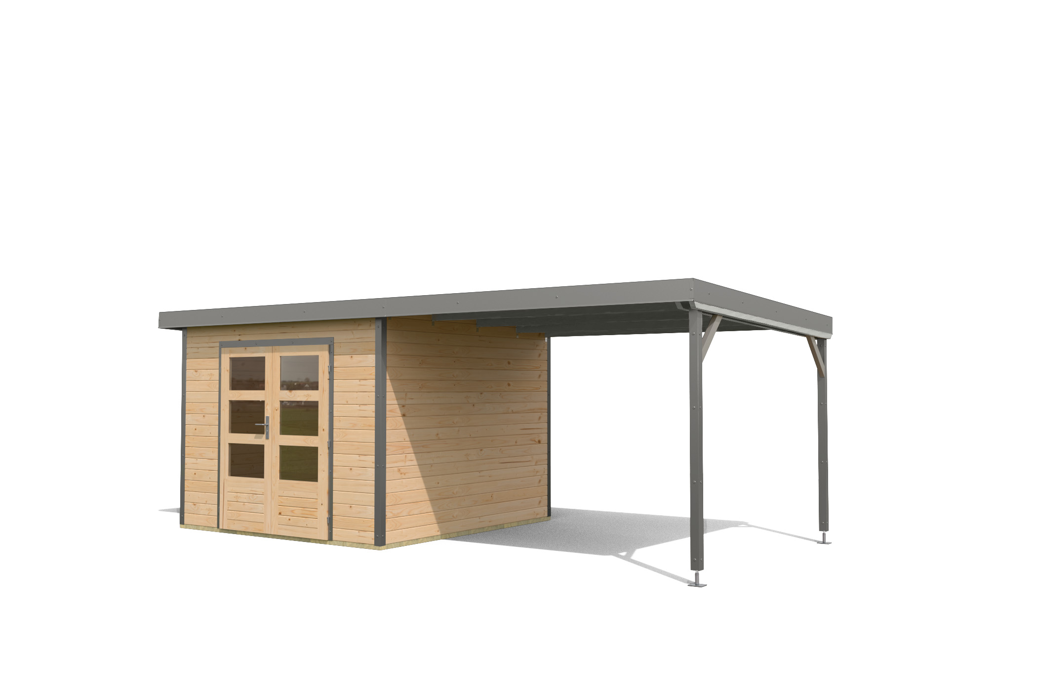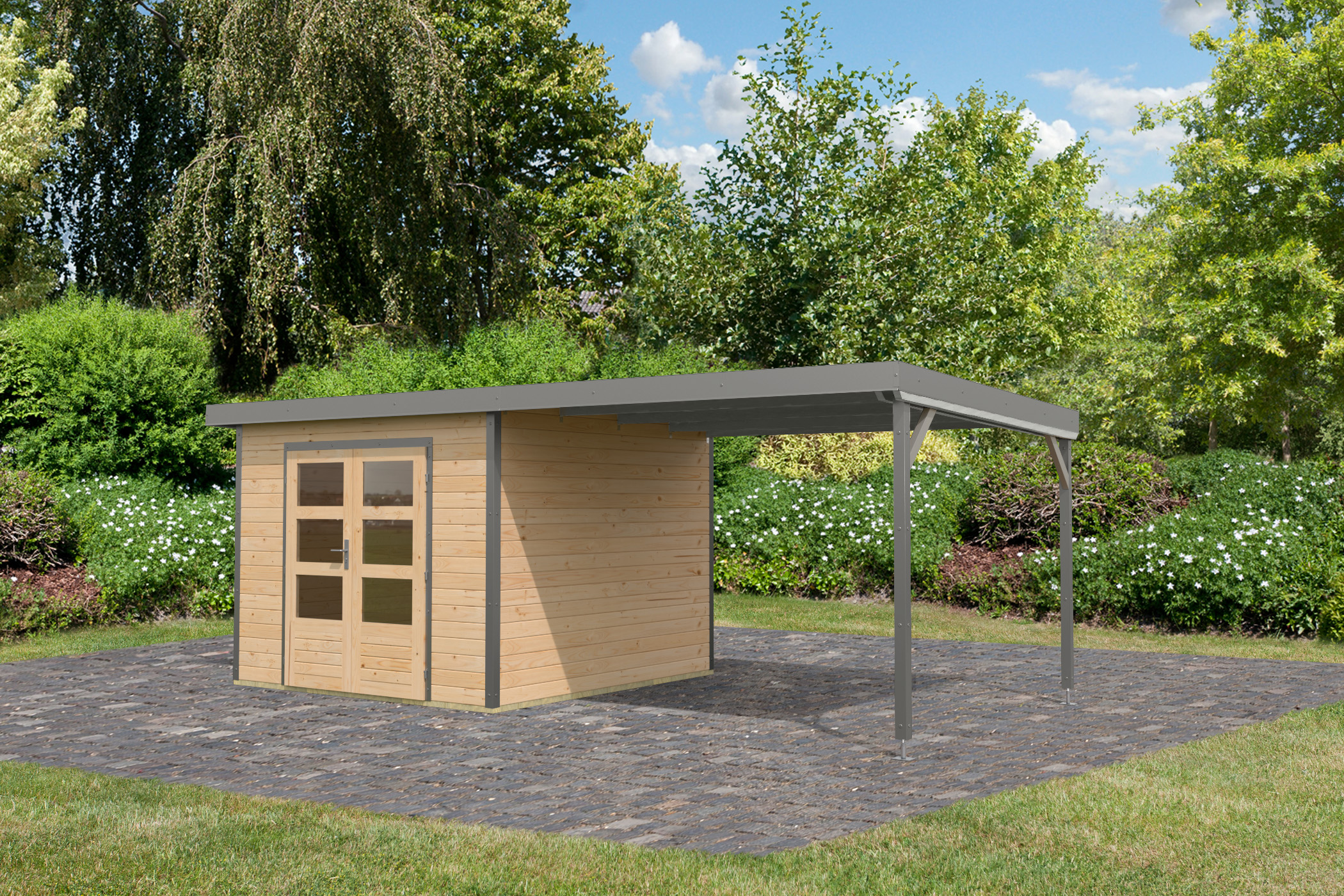 Karibu Gartenhaus Holz & Metall “Pluto 6” Pultdach mit Anbau/Terrasse modern in Natur