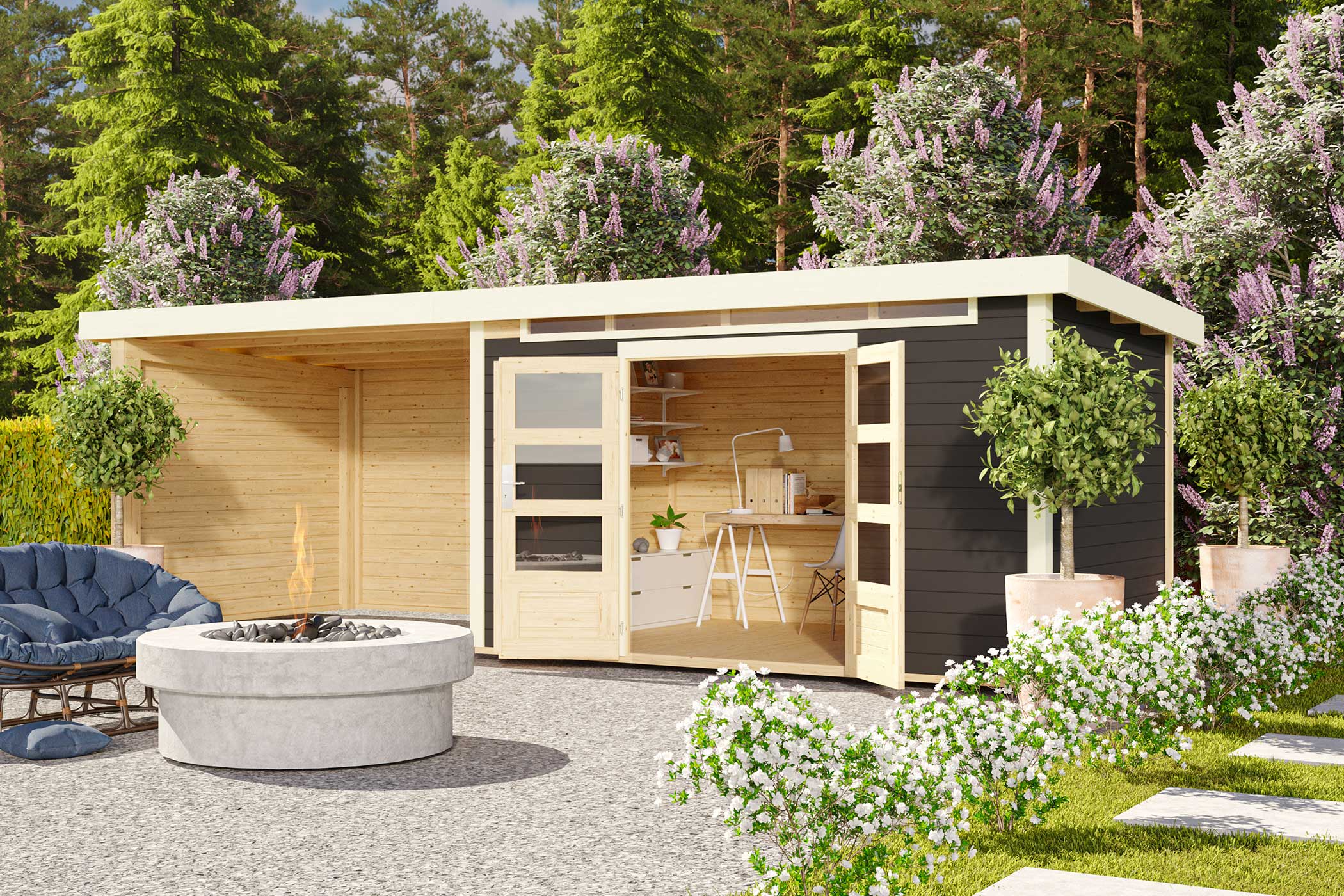 Karibu Gartenhaus “Kandern 7” Pultdach mit Anbau/Terrasse modern aus Holz in Terragrau