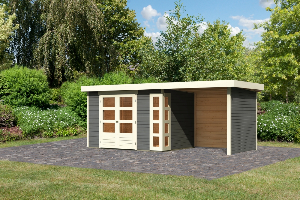Das Gartenhaus ist in Naturbelassen oder modernem Terragrau erhältlich. So können Sie Ihr Gartenhaus Kerko ganz nach den eigenen Vorlieben gestalten und es perfekt auf Ihren Garten abstimmen. Optional kann ein Anbaudach dazu erworben werden, welches zusätzliche Unterstellmöglichkeiten bietet. Das Anbaudach ist in den Breiten 1,50 m, 2,40 m und 2,80 m erhältlich.