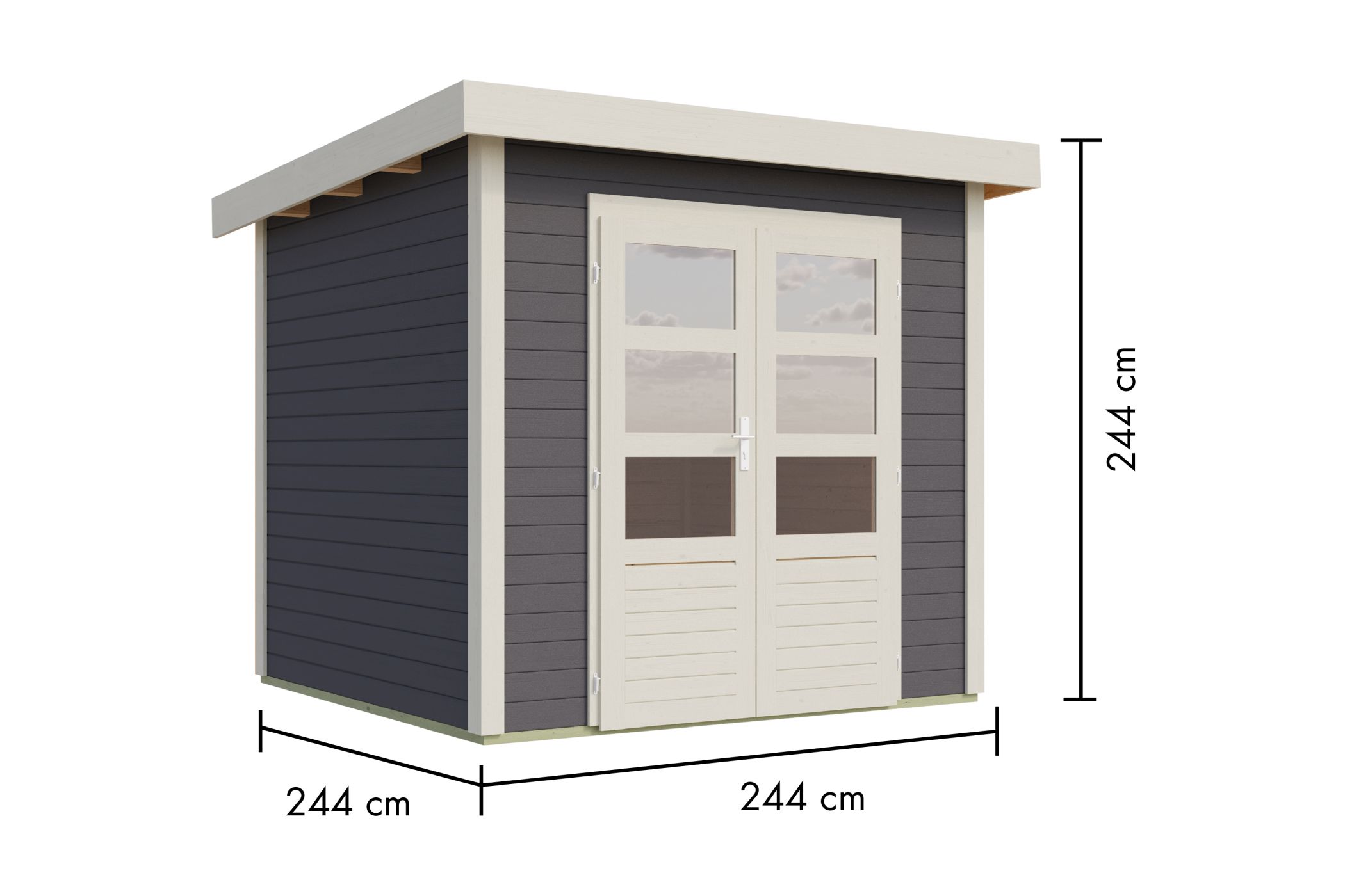 Das Gartenhaus Kolbin 3 XXL mit SOLAR-KIT, ein attraktives Pultdach. Das 28 mm Pultdachhaus aus nordischem Fichtenholz mit Steck-/Schraubsystem ist sowohl in Terragrau, als auch in Naturbelassen erhältlich. Eine große Besonderheit ist die extra hohe Tür mit einer Durchgangshöhe von 193 cm. Auch das Haus überzeugt dank der 28 mm starken Wandbohlen mit seiner Langlebigkeit. Die Doppelflügeltür mit drei Lichtausschnitten je Türflügel und Zylinderschloss schützt das Gartenhaus vor unbefugtem Eindringen. Das Dach des Gartenhauses mit einer Dachfläche von 7,3 m² können Sie effektiv mit unserer optional erhältlichen selbstklebenden Dachfolie vor Witterungseinflüsse schützen. Ihre Gegenstände im Hausinneren werden von unten durch einen optional erhältlichen Fußboden und durch im Lieferumfang enthaltene kesseldruckimprägnierte Bodenbalken geschützt. Gestalten Sie Ihren Garten stilvoll mit dem attraktiven Pultdachhaus Kolbin 3 XXL.