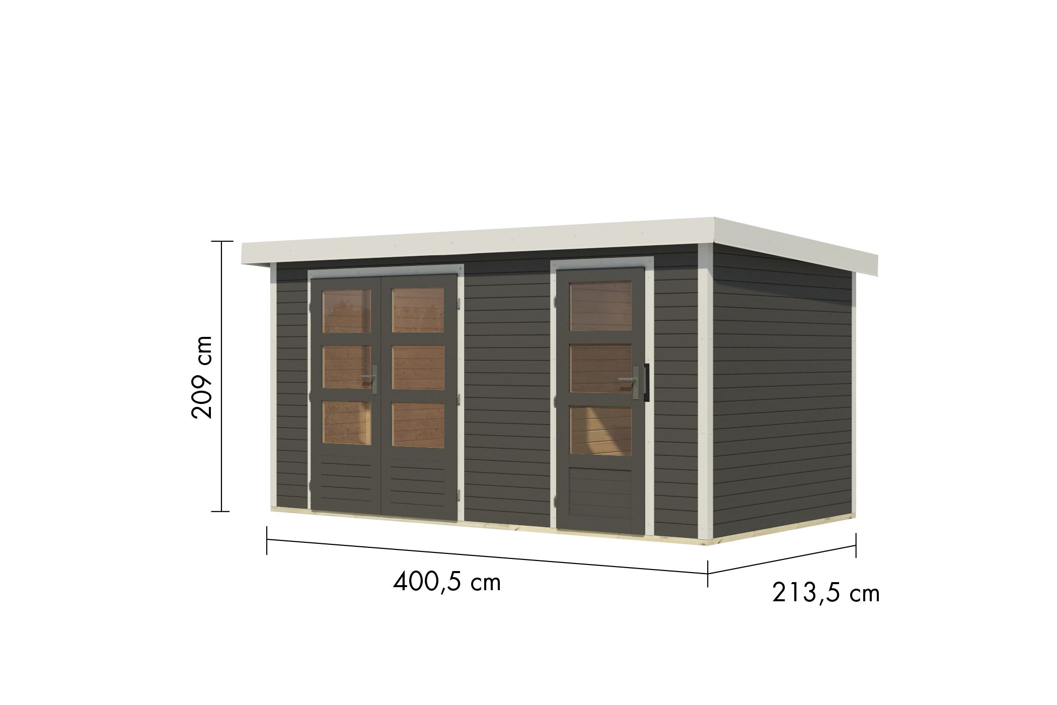 Attraktiv und praktisch das Gartenhaus Merkur mit Mittelwand. Durch die Mittelwand können die zwei Räume individuell eingesetzt werden. So können Sie den kleinen Raum zum Beispiel als Abstellraum Ihrer Gartengeräte nutzen und den größeren Raum als kleine Bastelwerkstatt gestalten. Ihrer Fantasie werden hier keine Grenzen gesetzt. Der große Raum wird durch eine Doppelflügeltür und der kleine Raum durch eine Einflügeltür mit je 3 Lichtausschnitten pro Türflügel und einem Zylinderschloss verschlossen. So werden Ihre Gegenstände im Inneren vor unbefugtem Entwenden geschützt. Ergänzen können Sie das Gartenhaus Merkur zum Beispiel mit dem passenden Fußboden. Mit einem Außenmaß von 400,5 x 213,5 cm hat es die ideale Größe für nahezu jeden Garten. Wenn Sie auf der Suche nach einem Gartenhaus mit zwei Räumen für noch mehr Ordnung sind, dann ist das Gartenhaus Merkur Ihr attraktives und praktisches Haus im eigenen Garten.